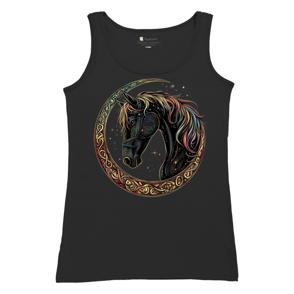 Celestial black horse with rainbow mane in Celtic moon. A mystical tribute to strength, movement, and spiritual beauty for horse and fantasy lovers.