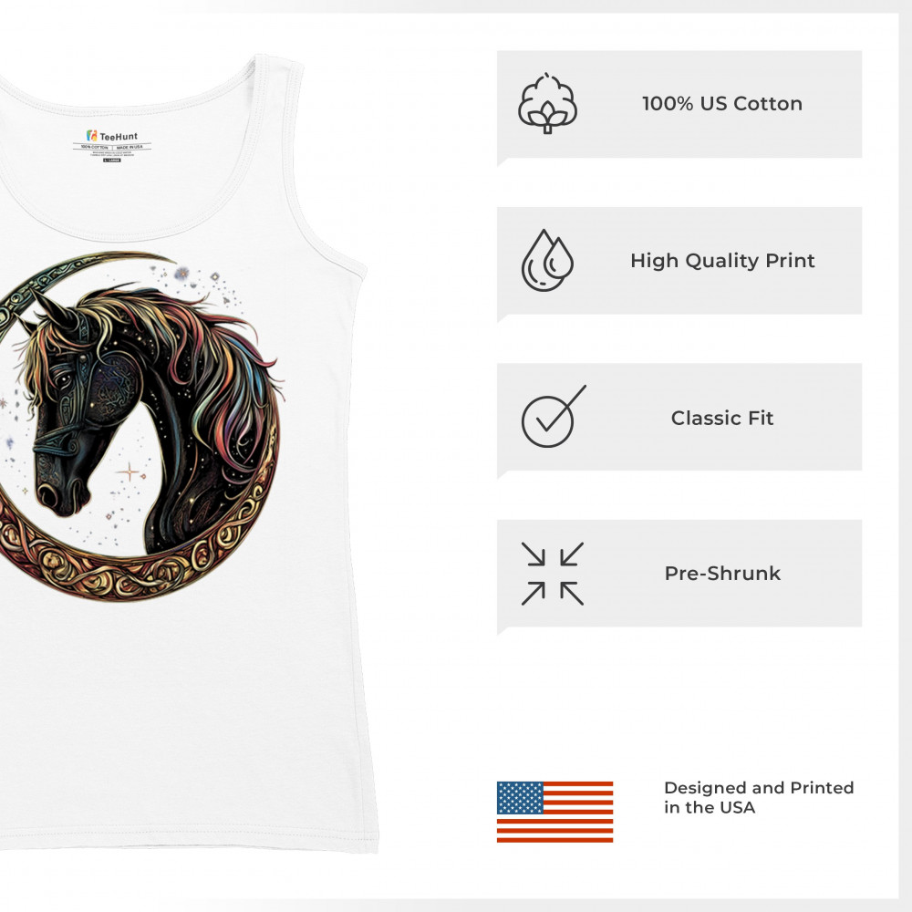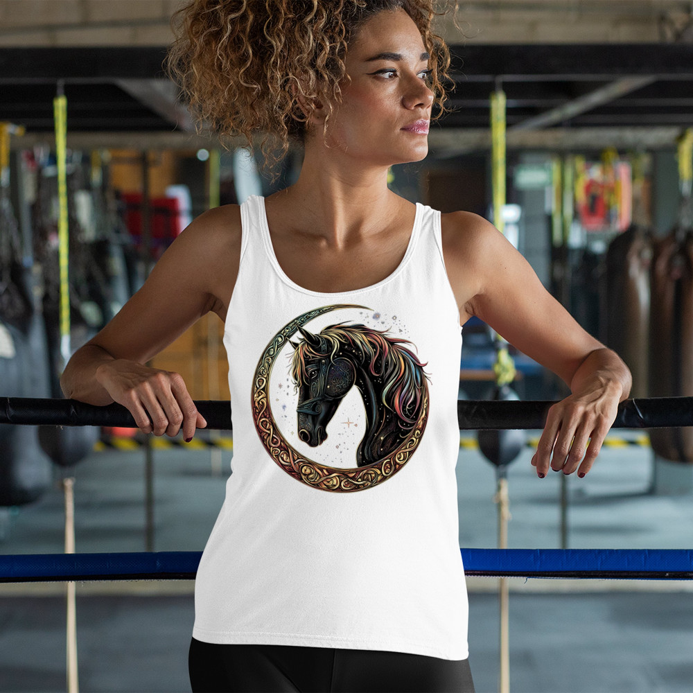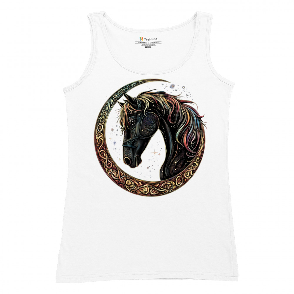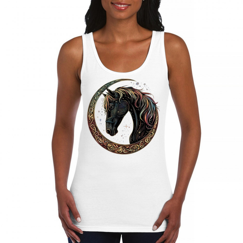 Celebrate the power and grace of the cosmos with this majestic black horse framed by a golden Celtic crescent moon. Its rainbow mane and celestial body symbolize strength, movement, mystery, and spiritual magic. A stunning piece for fantasy fans, equestrians, and dreamers who love horses and stars.