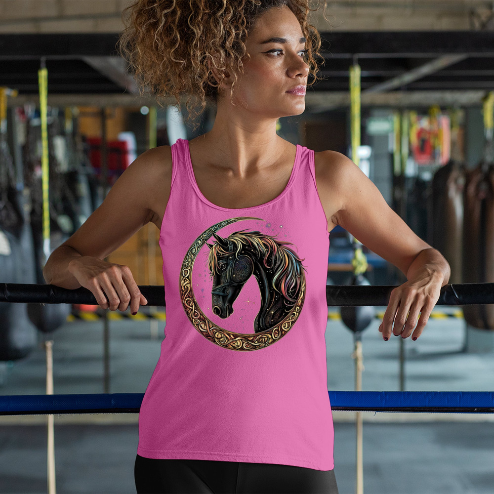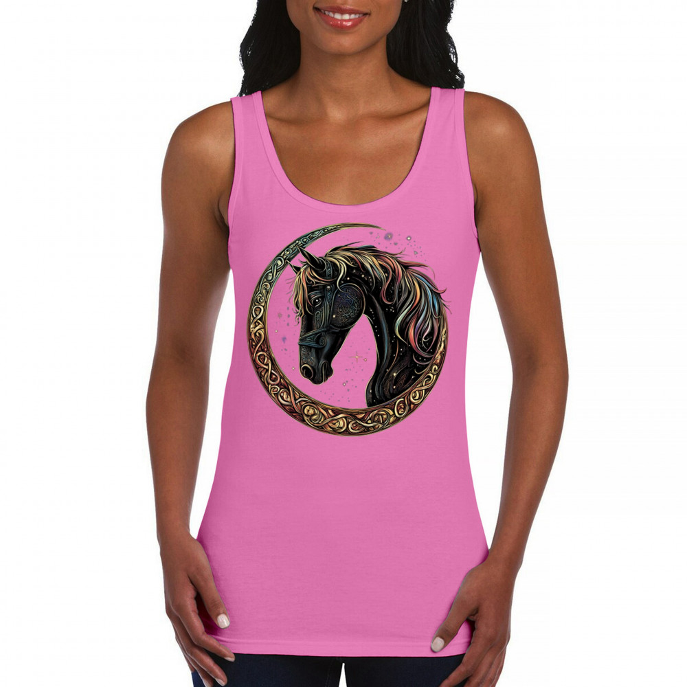 Celestial black horse with rainbow mane in Celtic moon. A mystical tribute to strength, movement, and spiritual beauty for horse and fantasy lovers.