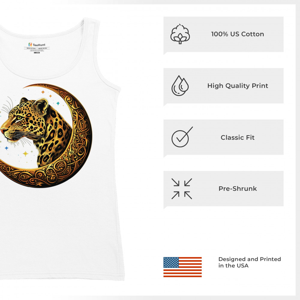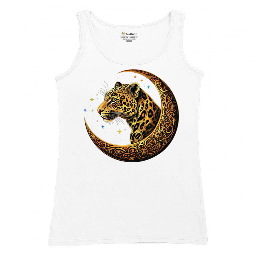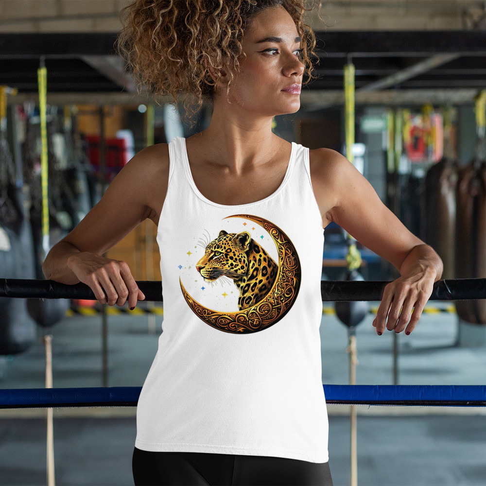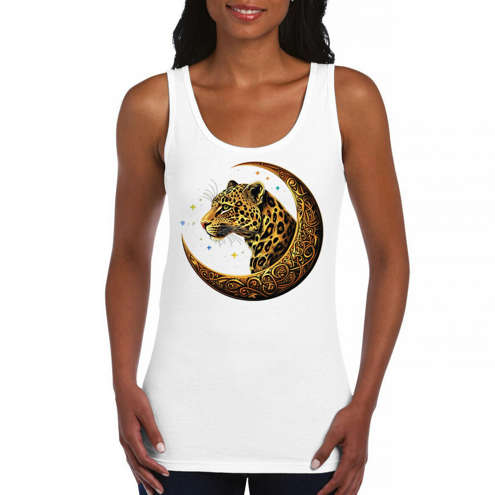 Unleash wild energy and spiritual symbolism with this bold leopard design set inside a golden Celtic crescent moon. A cosmic starry background amplifies its mystical vibe, symbolizing agility, independence, and awareness. Perfect for big cat lovers, jungle animal fans, and seekers of fantasy or tribal-inspired art.