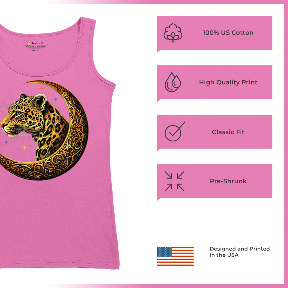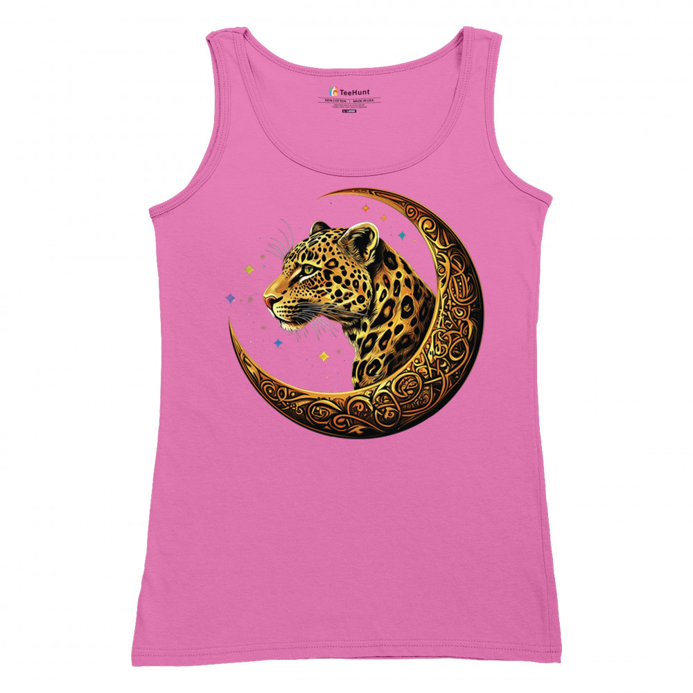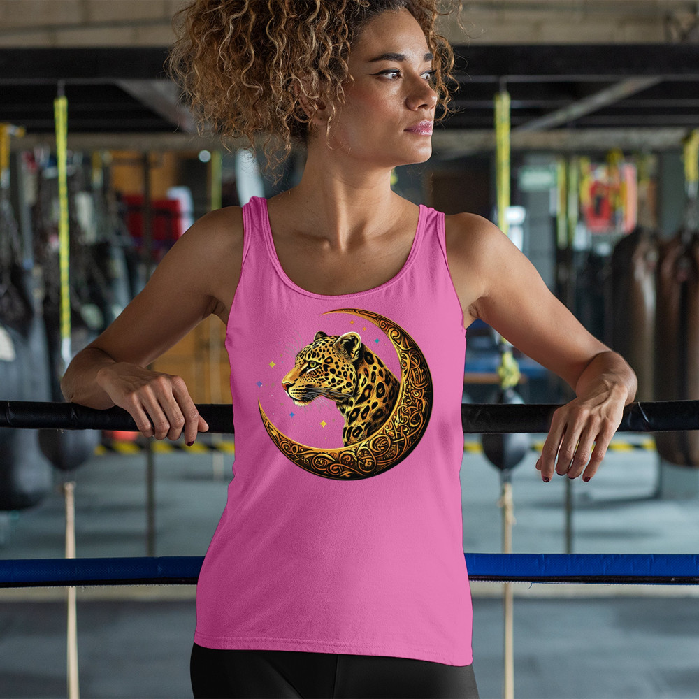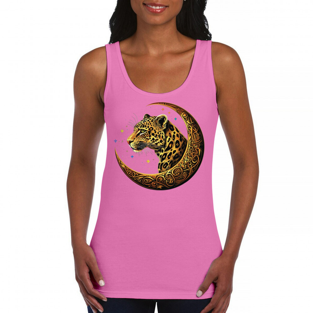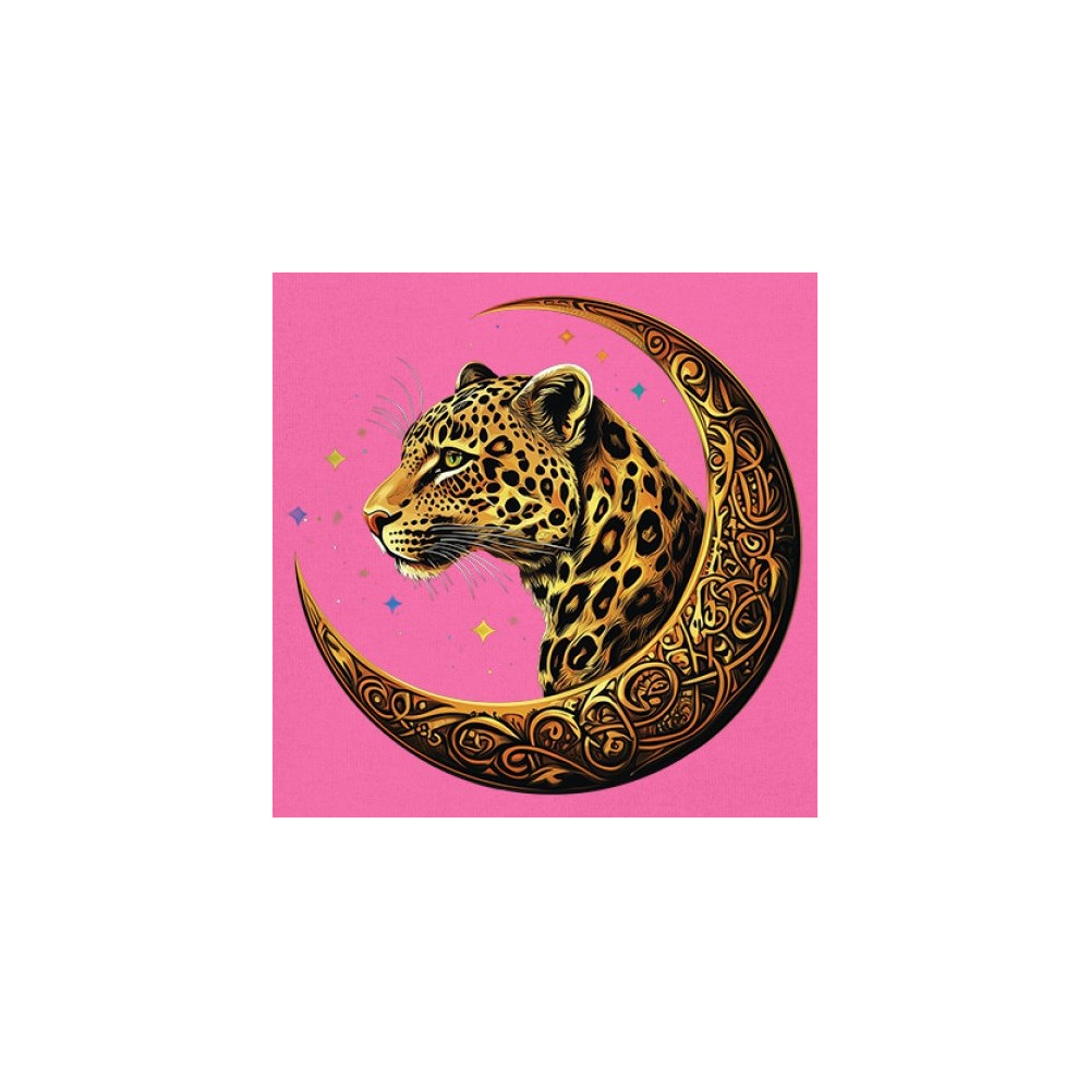 Unleash wild energy and spiritual symbolism with this bold leopard design set inside a golden Celtic crescent moon. A cosmic starry background amplifies its mystical vibe, symbolizing agility, independence, and awareness. Perfect for big cat lovers, jungle animal fans, and seekers of fantasy or tribal-inspired art.
