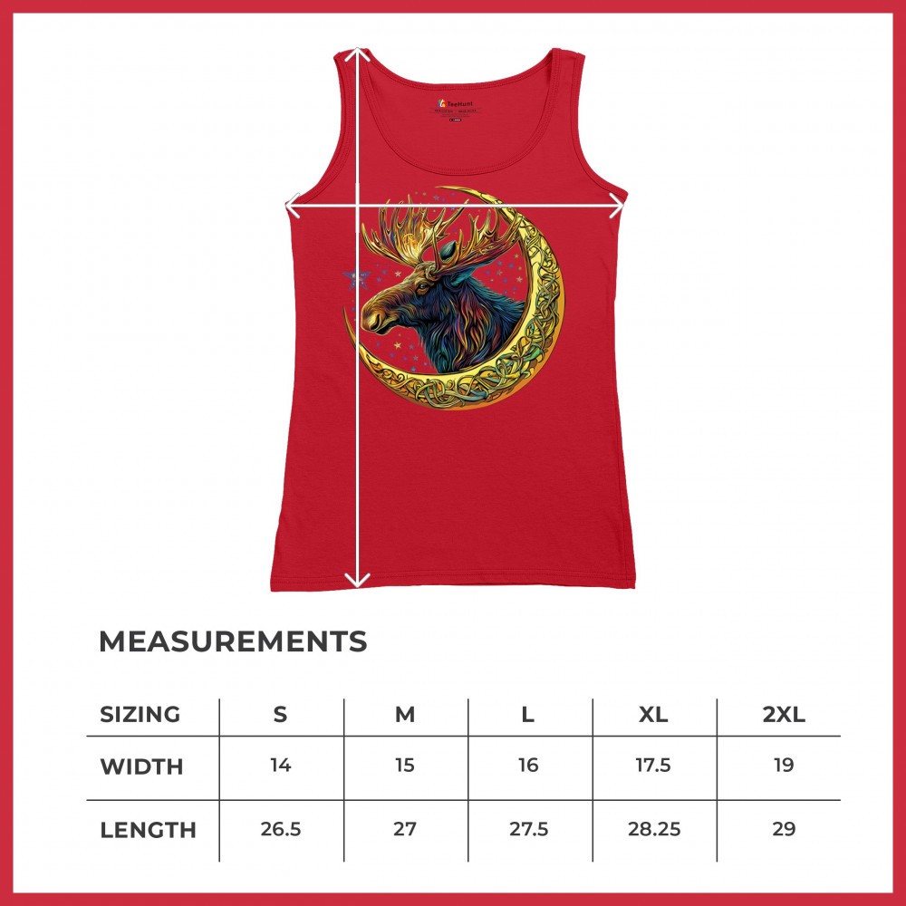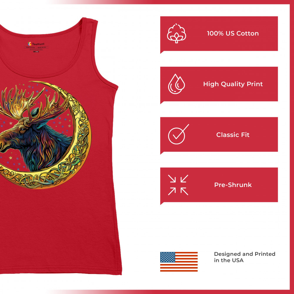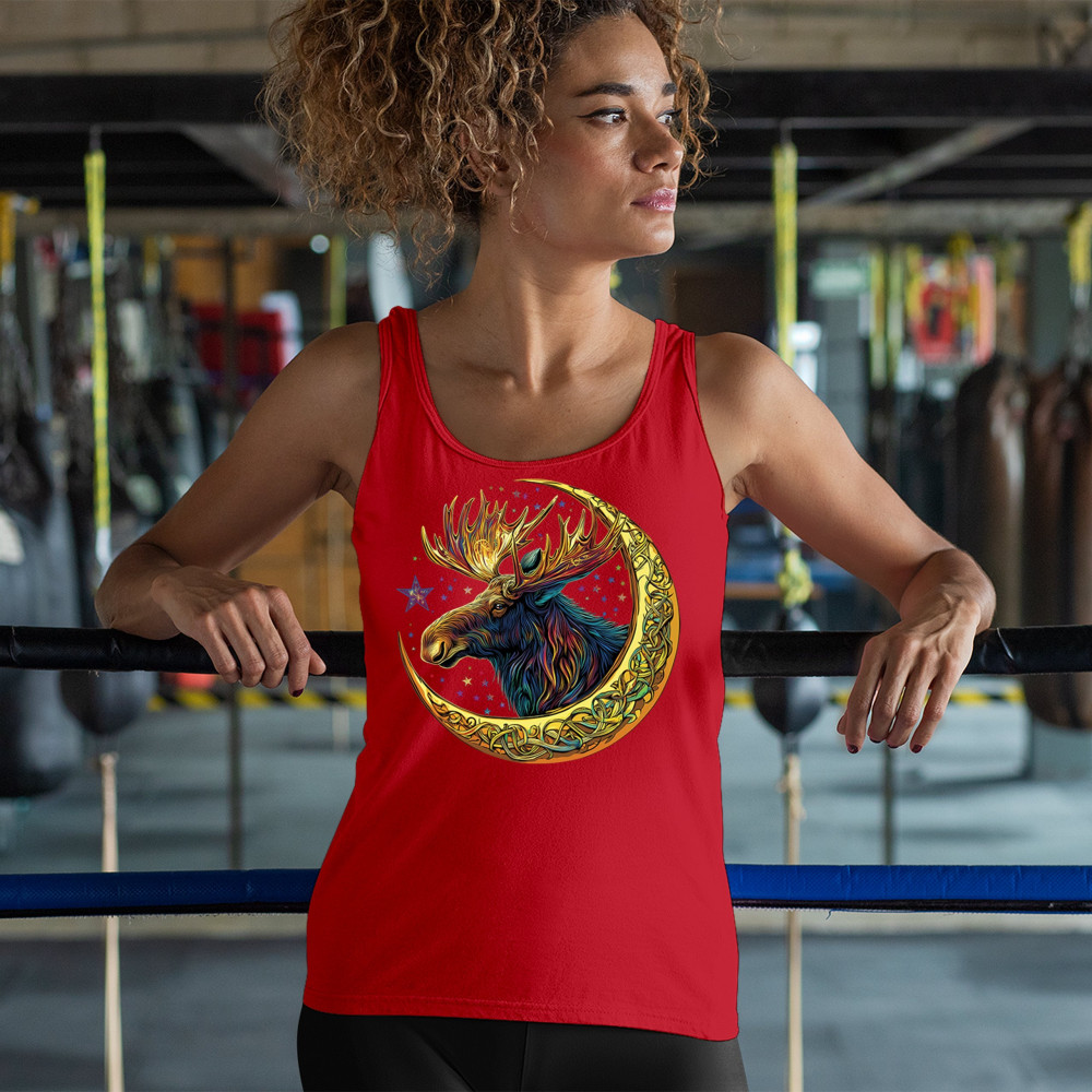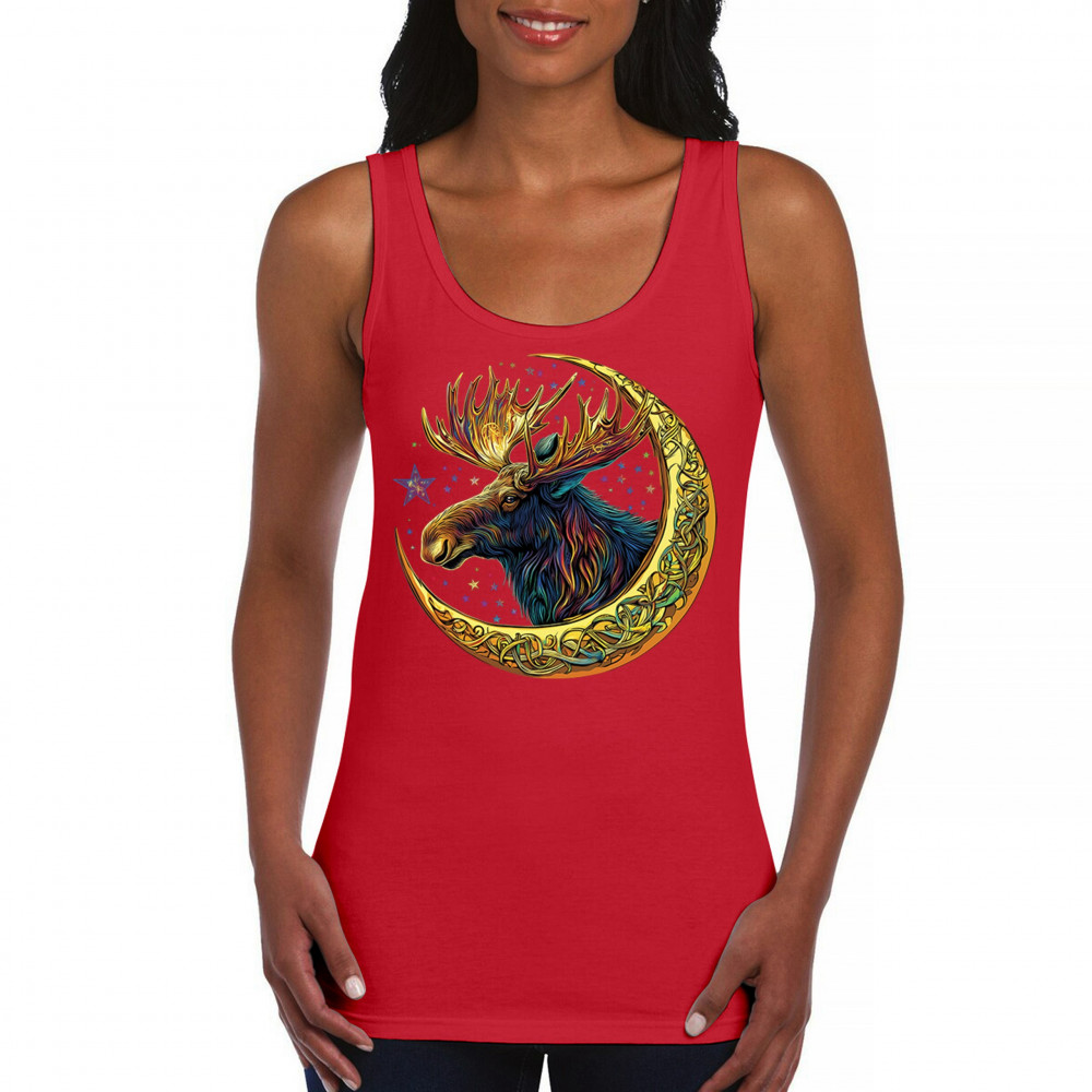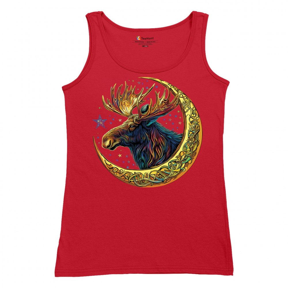 Mystical moose in gold Celtic crescent moon design—symbolizes strength, nature wisdom, and cosmic spirit for fantasy lovers and woodland fans.