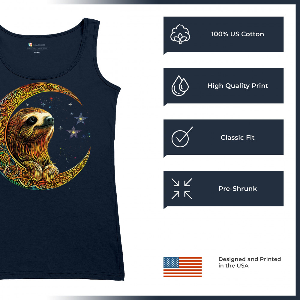 Celebrate peace and presence with this stunning sloth design cradled in a gold Celtic crescent moon. Surrounded by a vibrant starry sky, the image blends jungle whimsy with tribal patterns and mystical vibes. A perfect design for lovers of fantasy animals, mindfulness, and slow living. A beautiful tribute to spiritual stillness and cosmic calm.