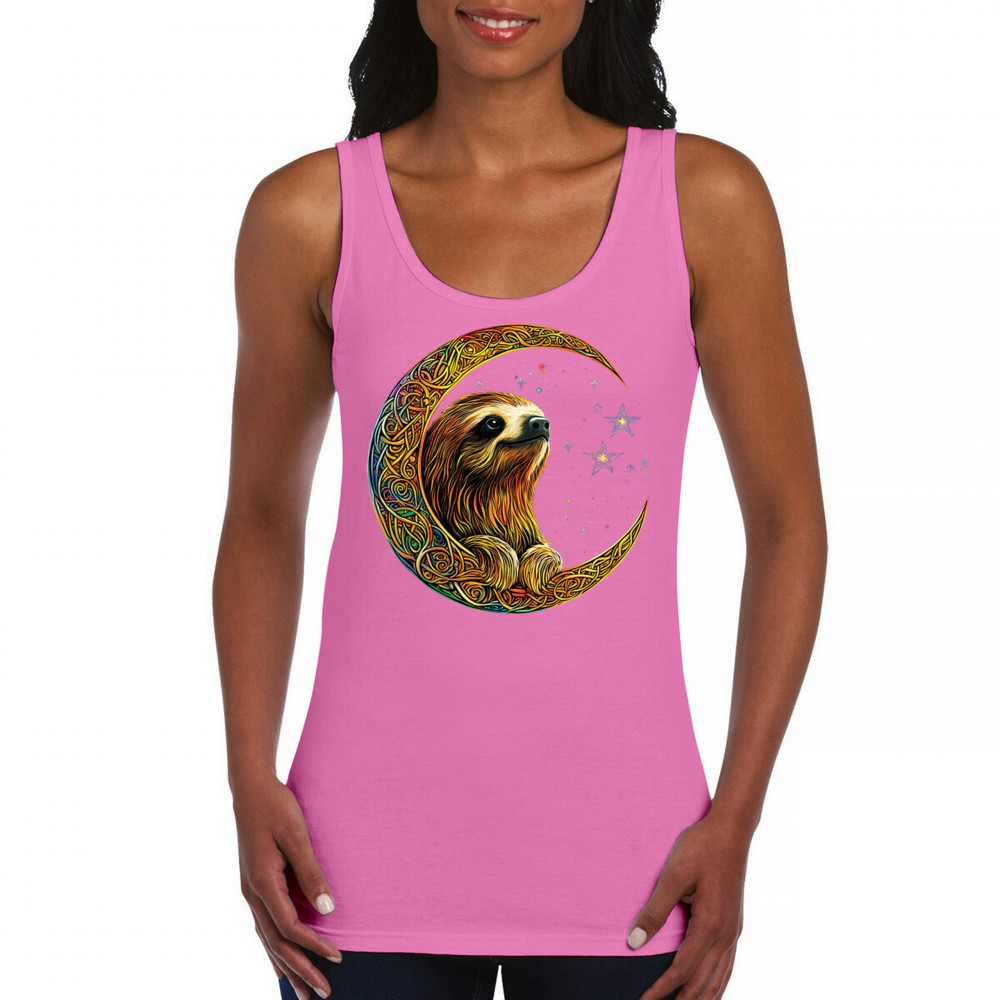 Peaceful sloth in Celtic crescent moon with cosmic sky. Symbol of mindfulness, rest, and intentional living. A calm, magical fantasy design.