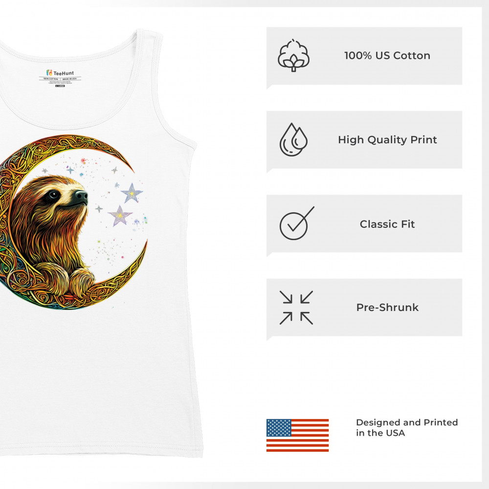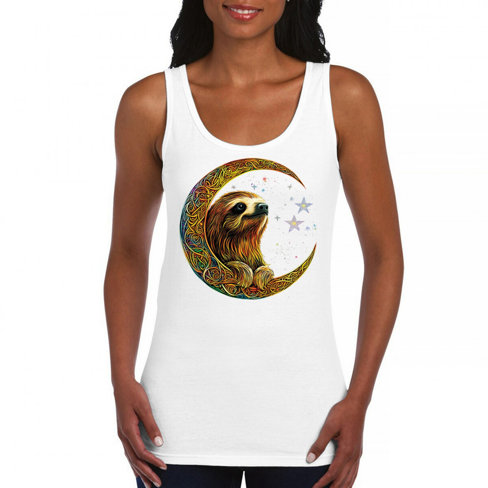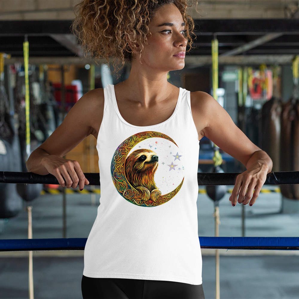 Celebrate peace and presence with this stunning sloth design cradled in a gold Celtic crescent moon. Surrounded by a vibrant starry sky, the image blends jungle whimsy with tribal patterns and mystical vibes. A perfect design for lovers of fantasy animals, mindfulness, and slow living. A beautiful tribute to spiritual stillness and cosmic calm.