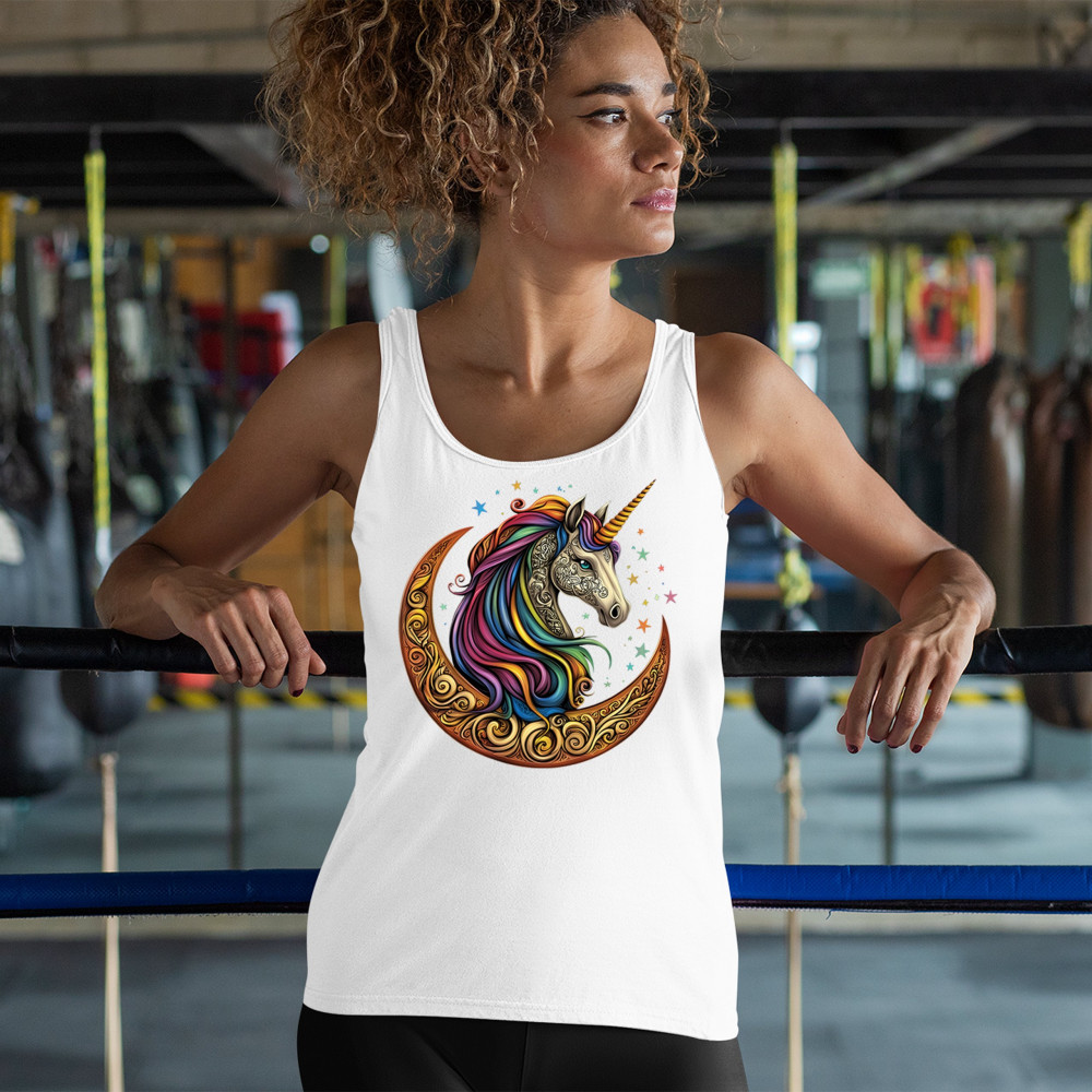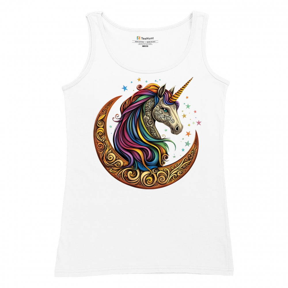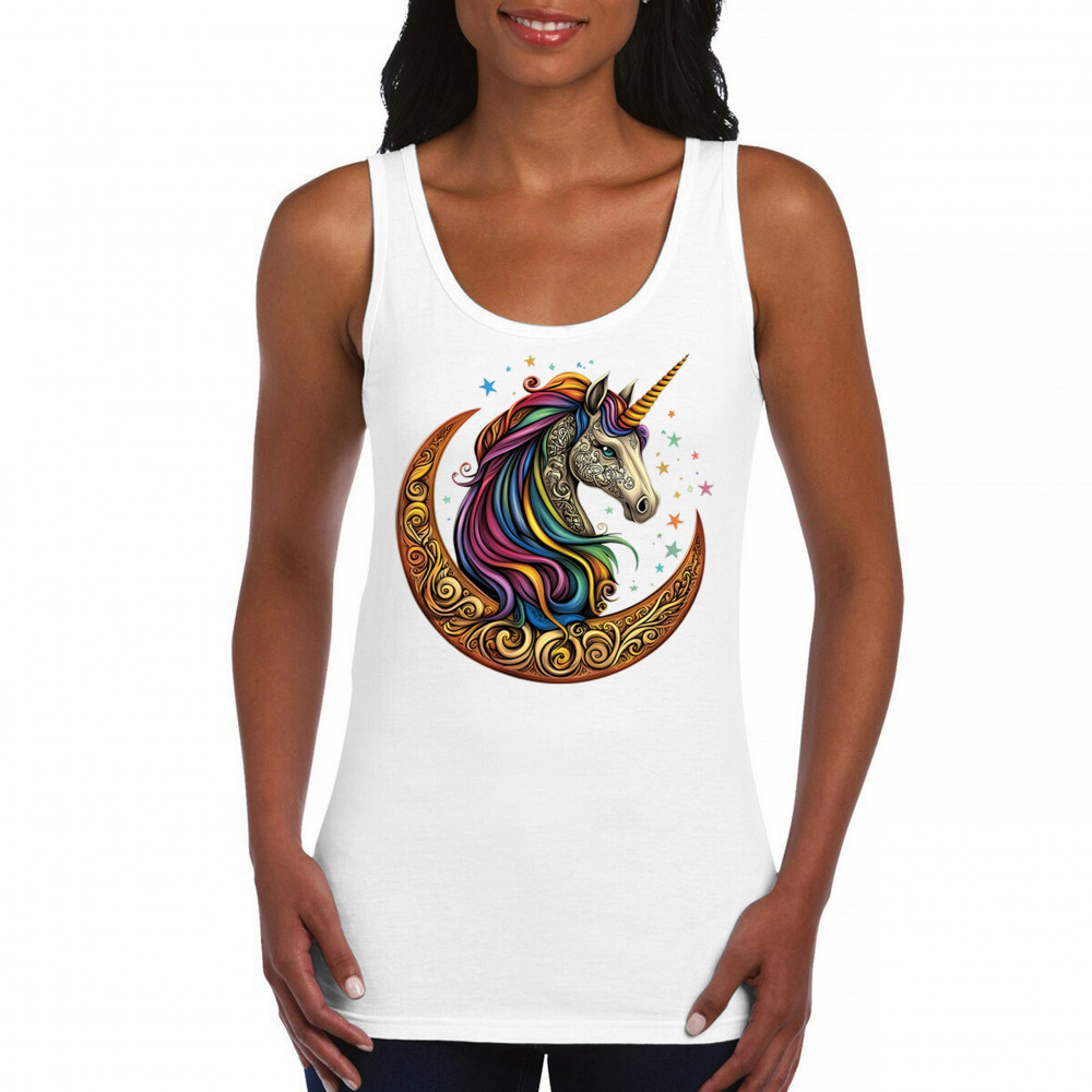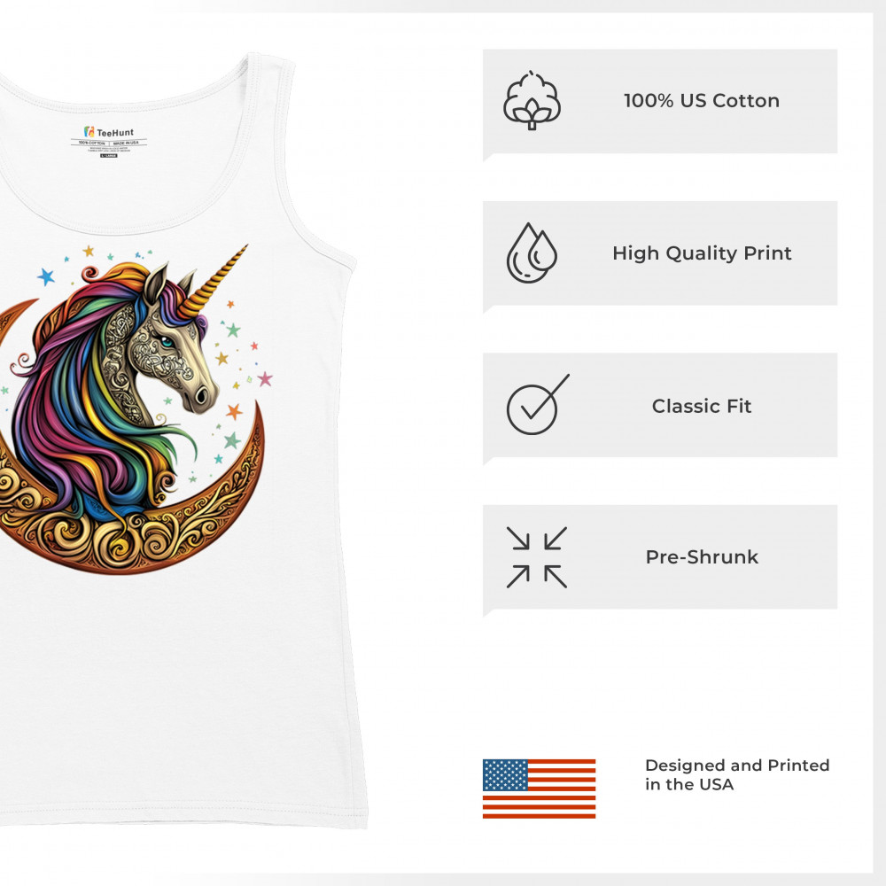 Rainbow-maned unicorn in golden Celtic moon design—perfect for fantasy lovers, dreamers, and unicorn fans who believe in magic and spirit.