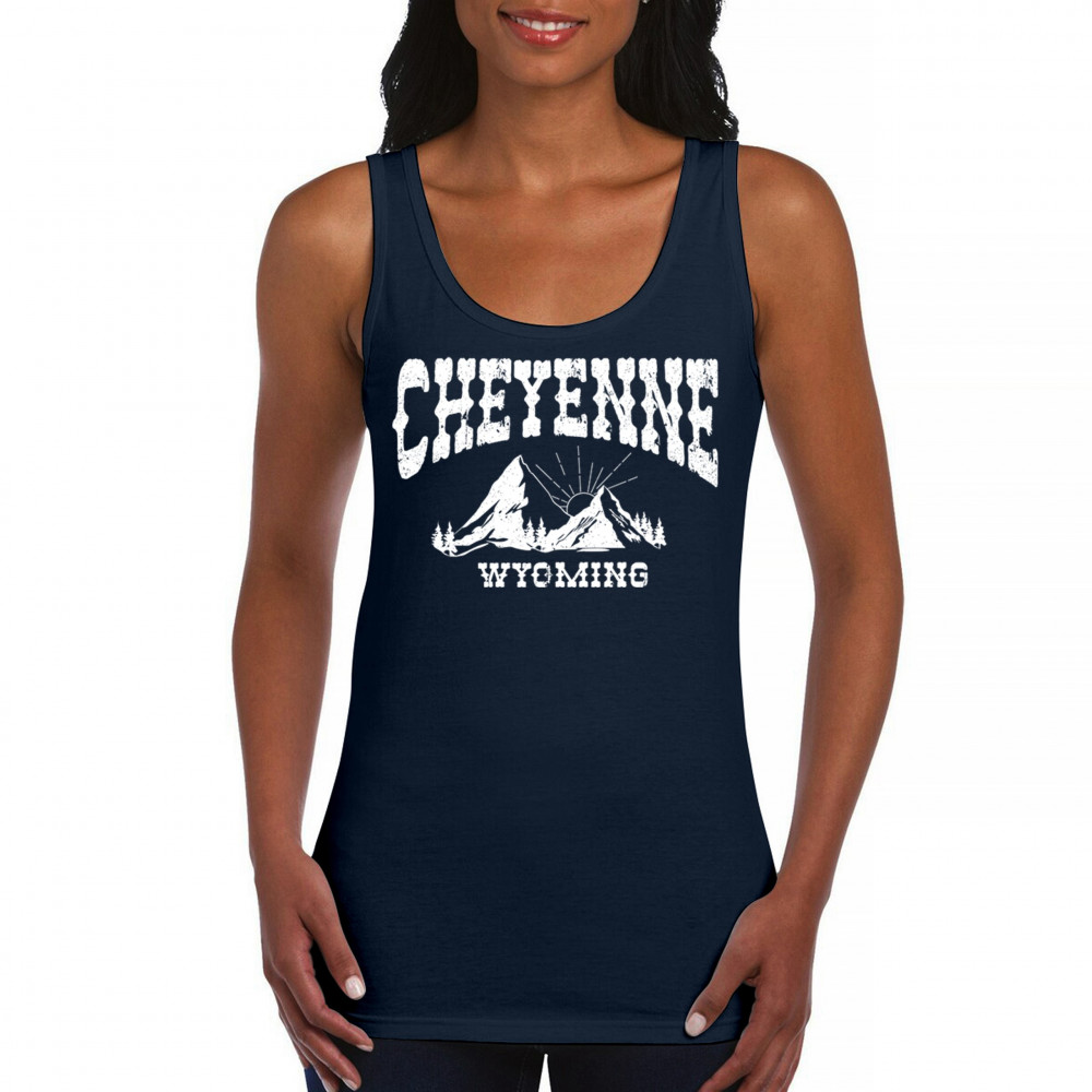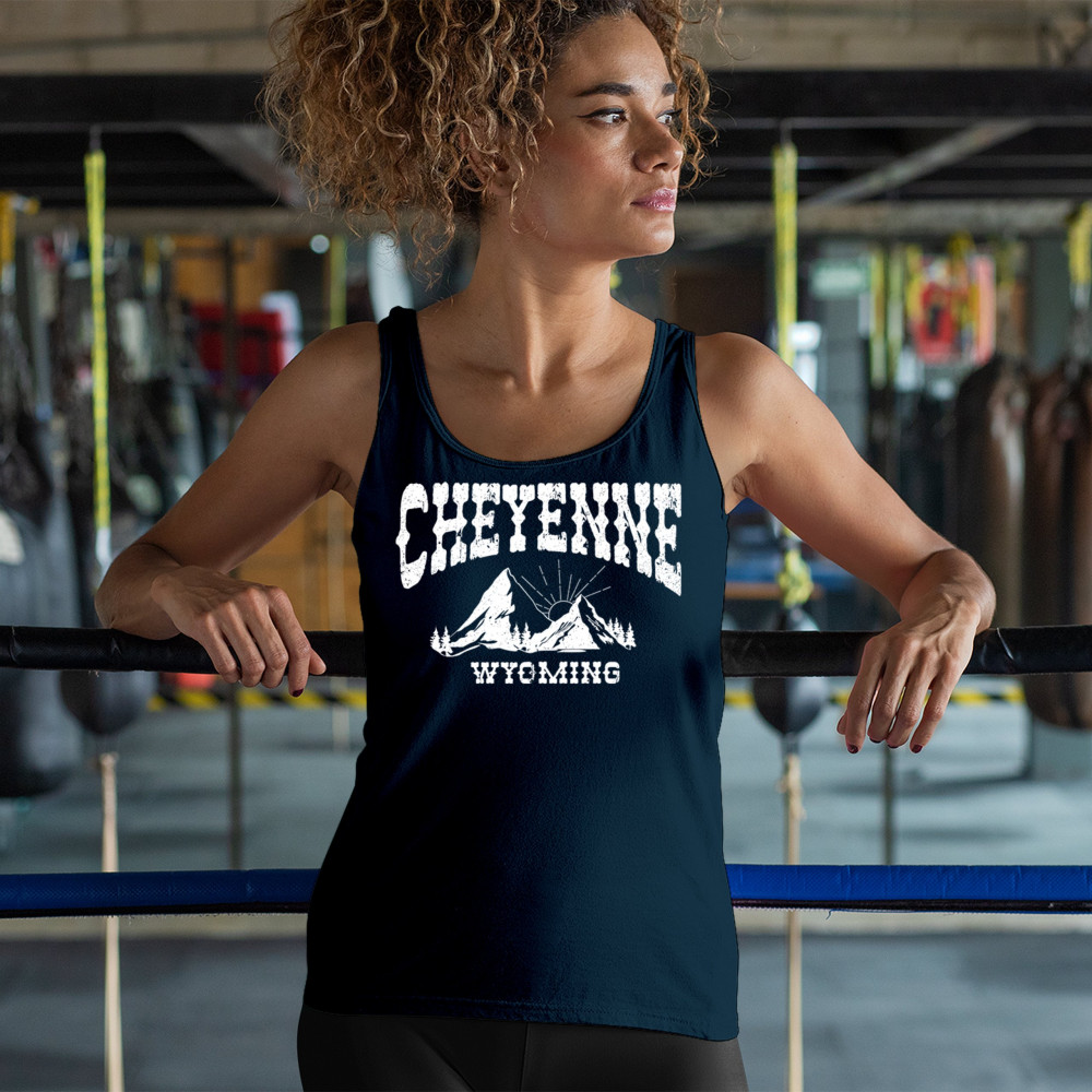 Vintage Cheyenne Wyoming design with mountain sunrise for outdoor lovers and locals. Perfect for travel, hiking, or Western pride.