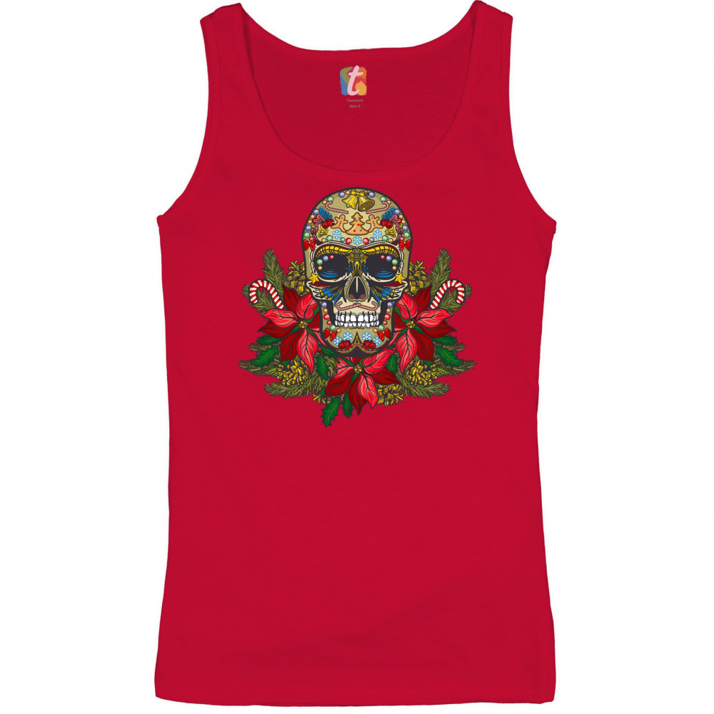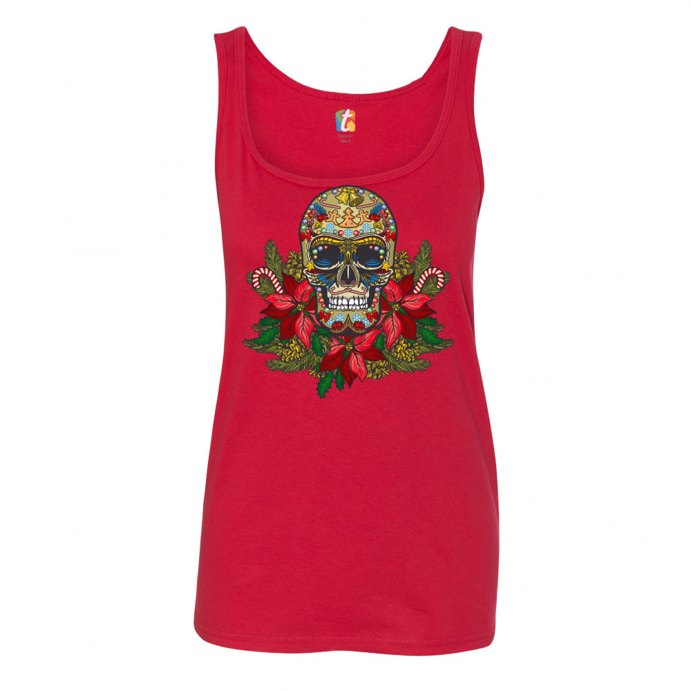 A print featuring a gorgeous sugar skull sitting atop of mistletoe. The skull is decorated with bells, candy canes and gingerbread men dancing around a Christmas tree on the forehead. It has candy canes instead of mustaches and wings underneath the eye so