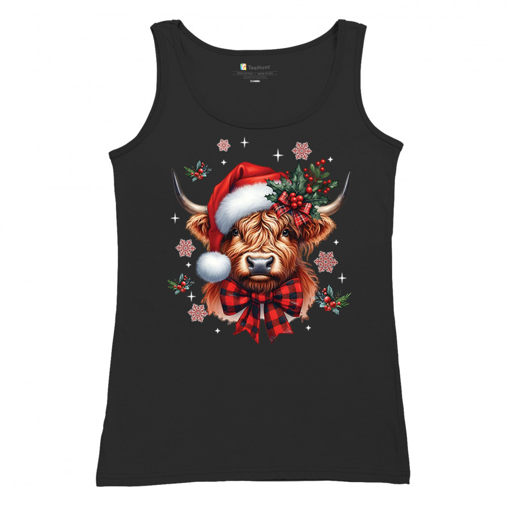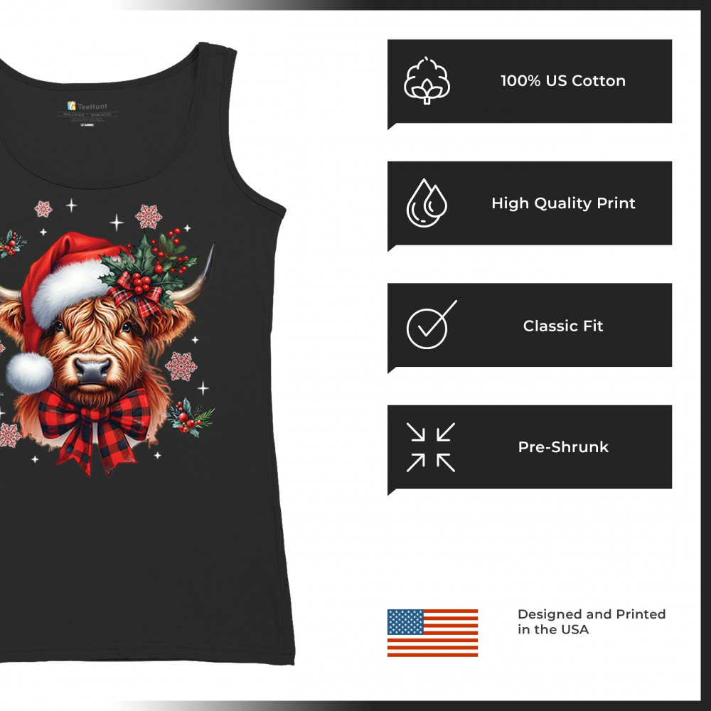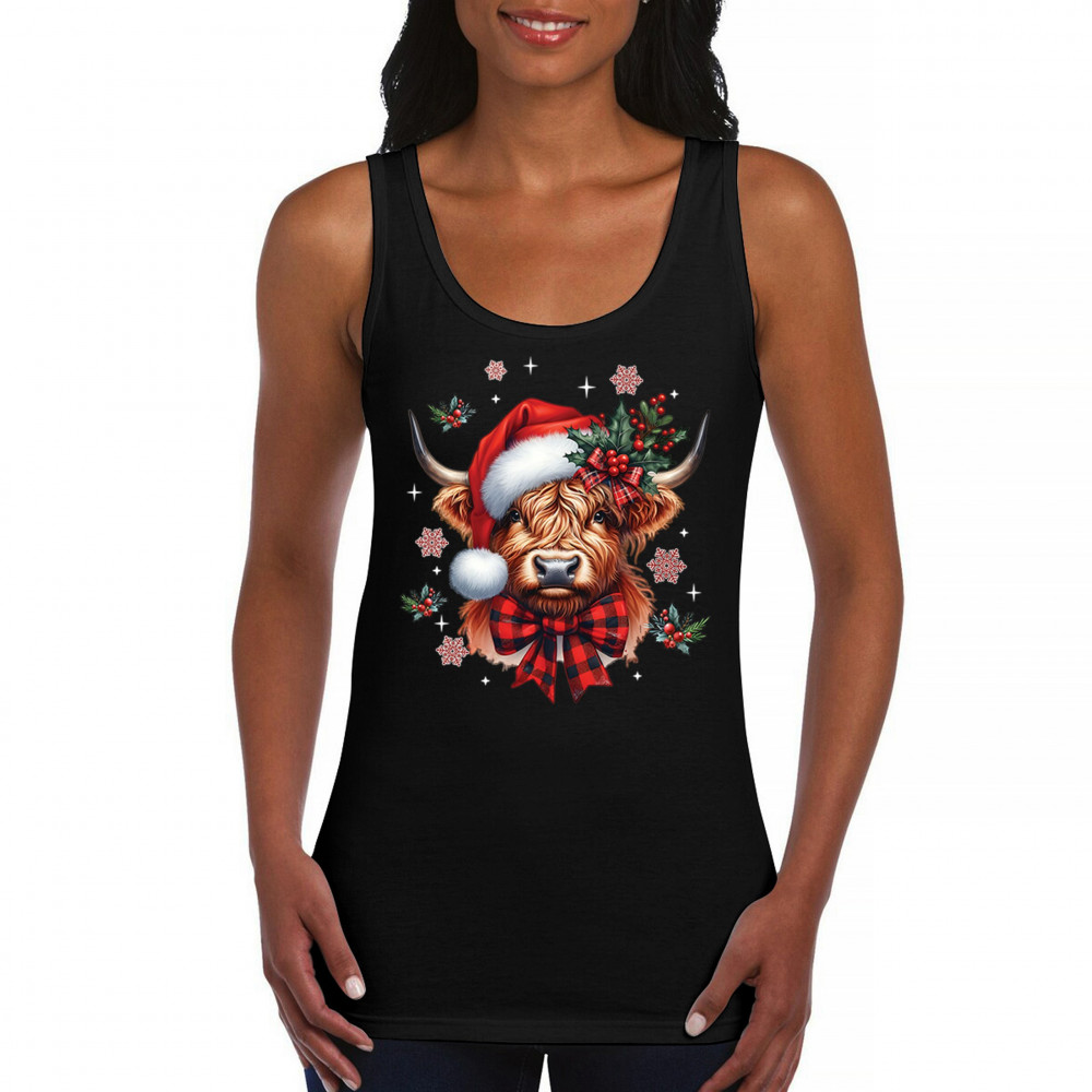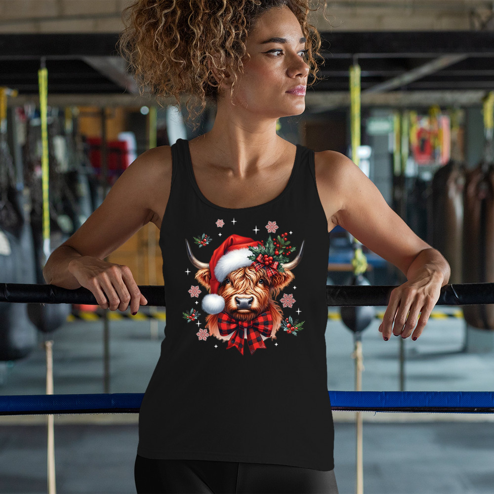 Festive Highland cow Christmas design with Santa hat, plaid bow, holly, and rustic farmhouse holiday charm. Perfect for cozy winter decor.