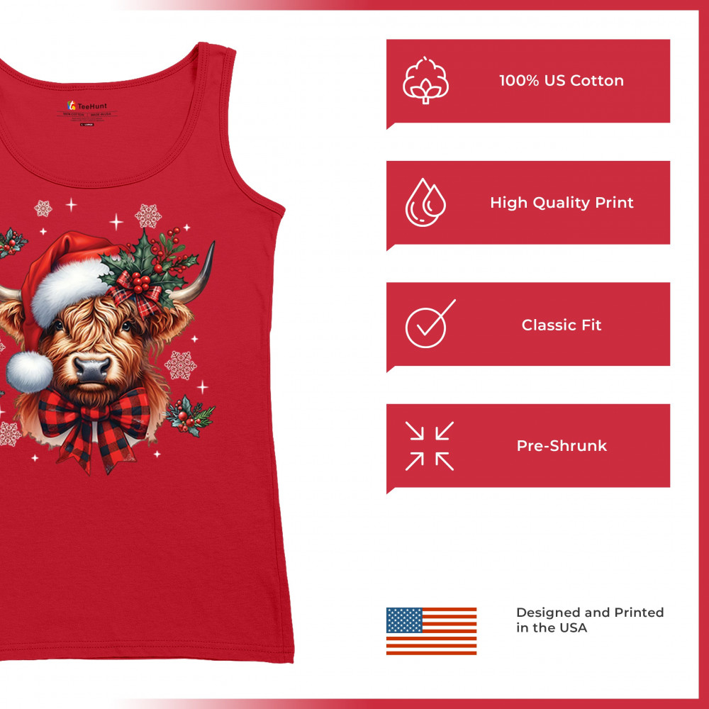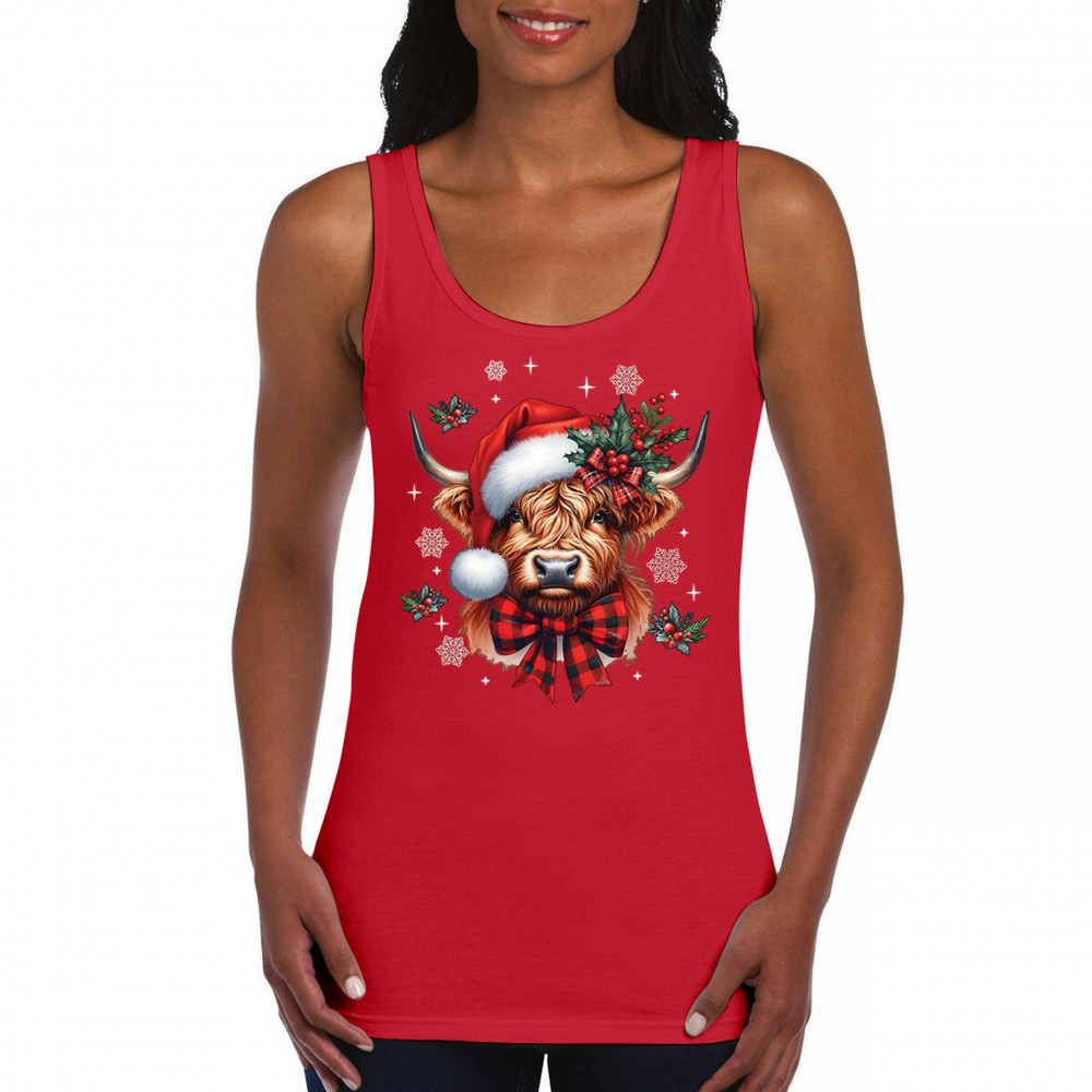 Festive Highland cow Christmas design with Santa hat, plaid bow, holly, and rustic farmhouse holiday charm. Perfect for cozy winter decor.