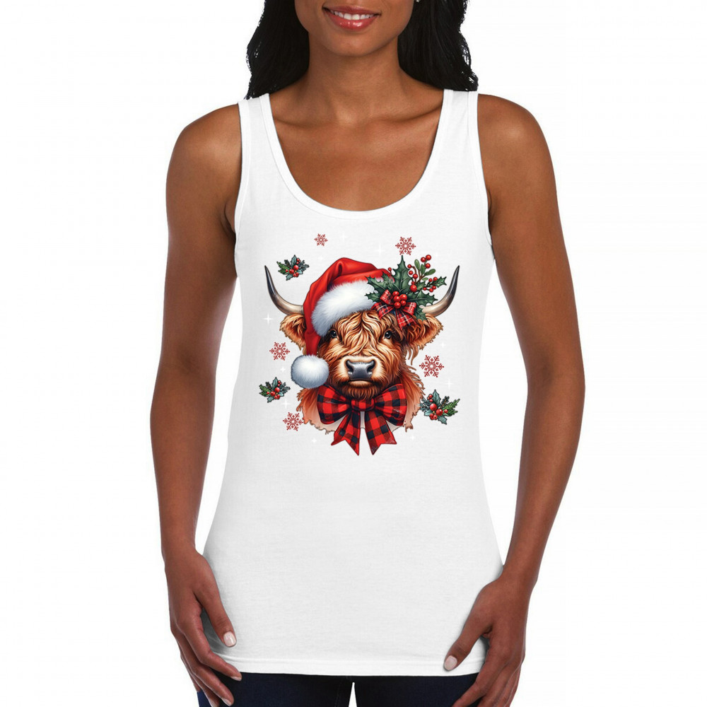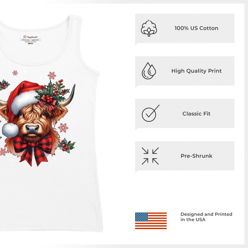Festive Highland cow Christmas design with Santa hat, plaid bow, holly, and rustic farmhouse holiday charm. Perfect for cozy winter decor.