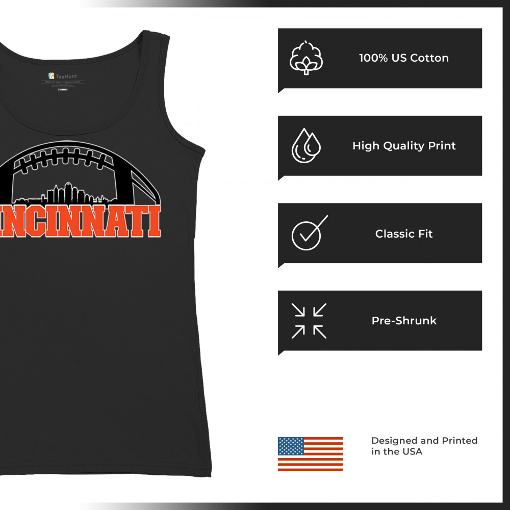 Discover the perfect blend of football passion and Cincinnati pride with this eye-catching design. Featuring the Queen City skyline under a bold football arch, this graphic is ideal for fans cheering on their team or celebrating their love for the city. Whether at a tailgate, game, or casual outing, this design lets you show your loyalty in style. A thoughtful gift for Cincinnati football enthusiasts!