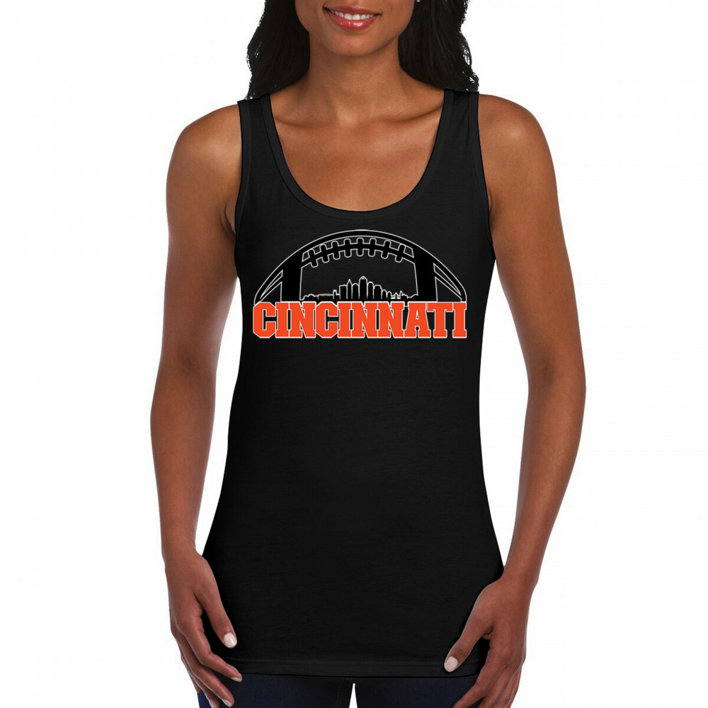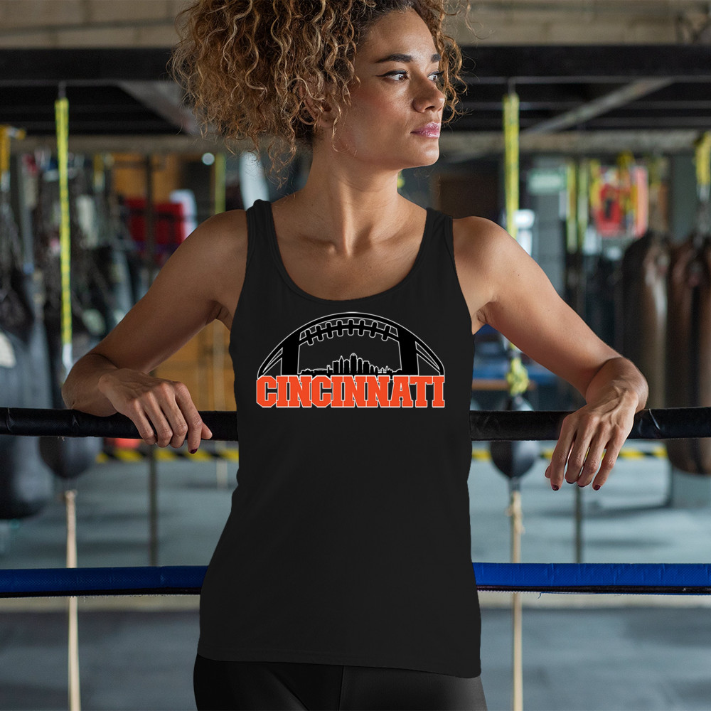 Celebrate Cincinnati and football with this bold skyline design under a football arch. Perfect for fans, tailgates, and game days!