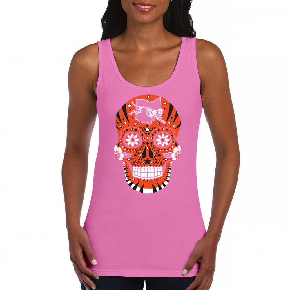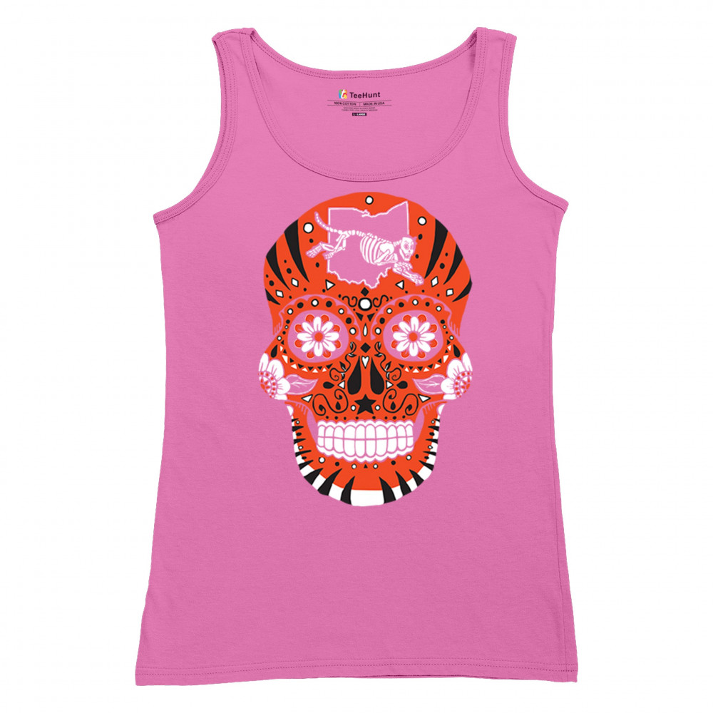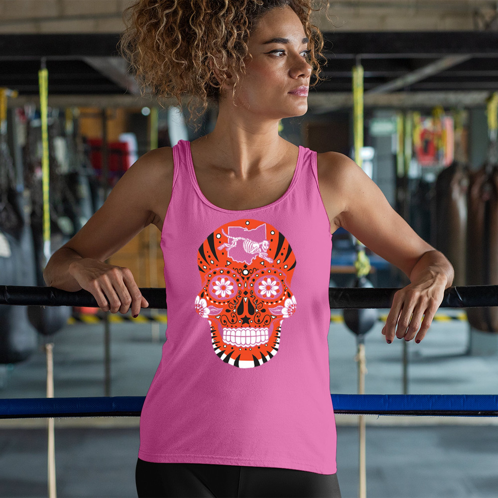 Cinci Sugar Skull with Queen City Paw, underdog grit, black & orange pride, Game Day energy, and playoff vibes.