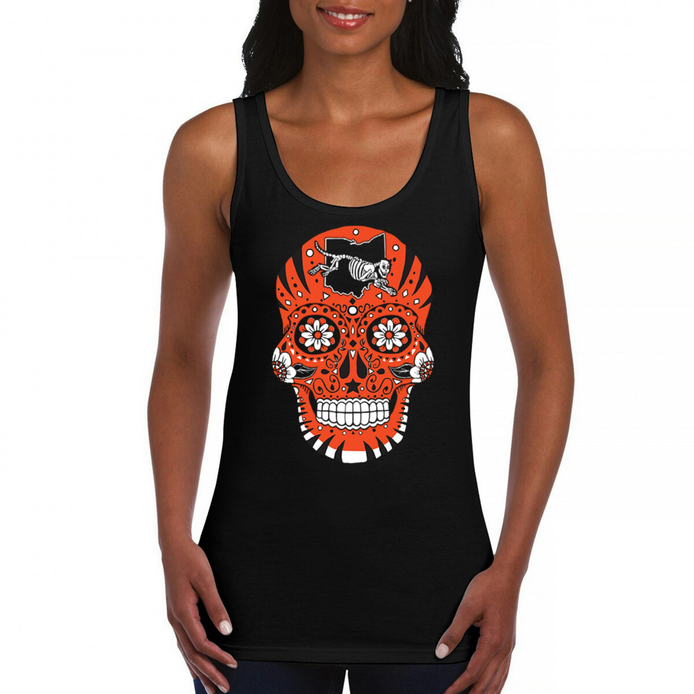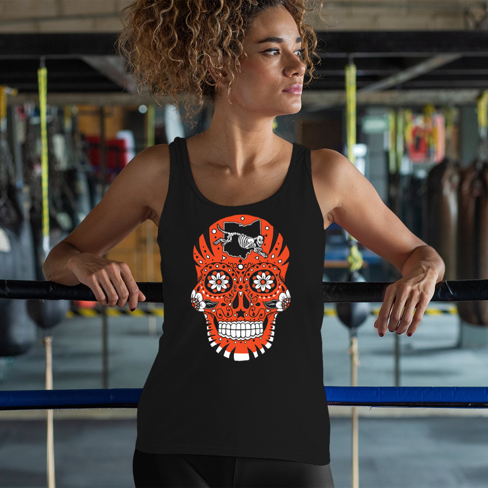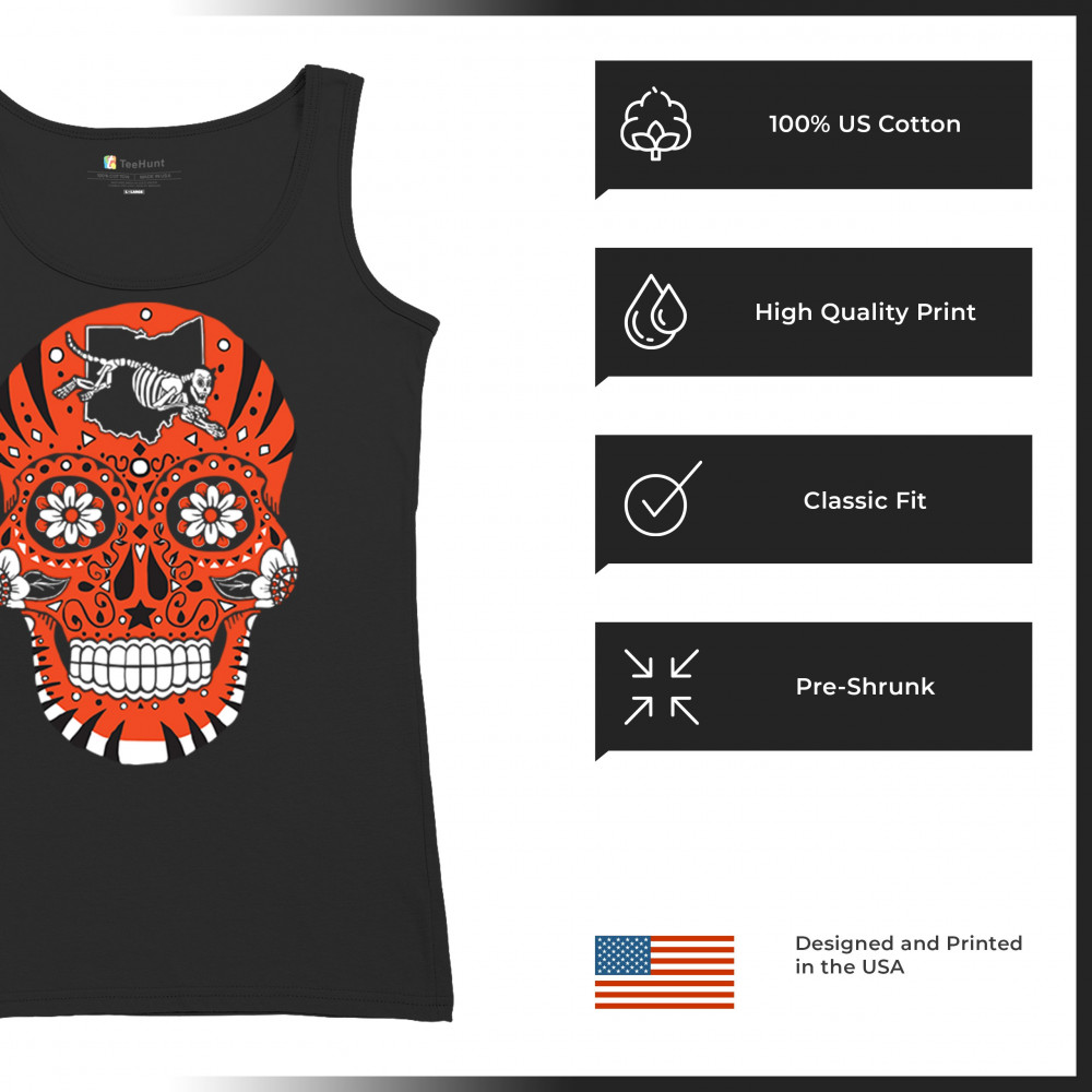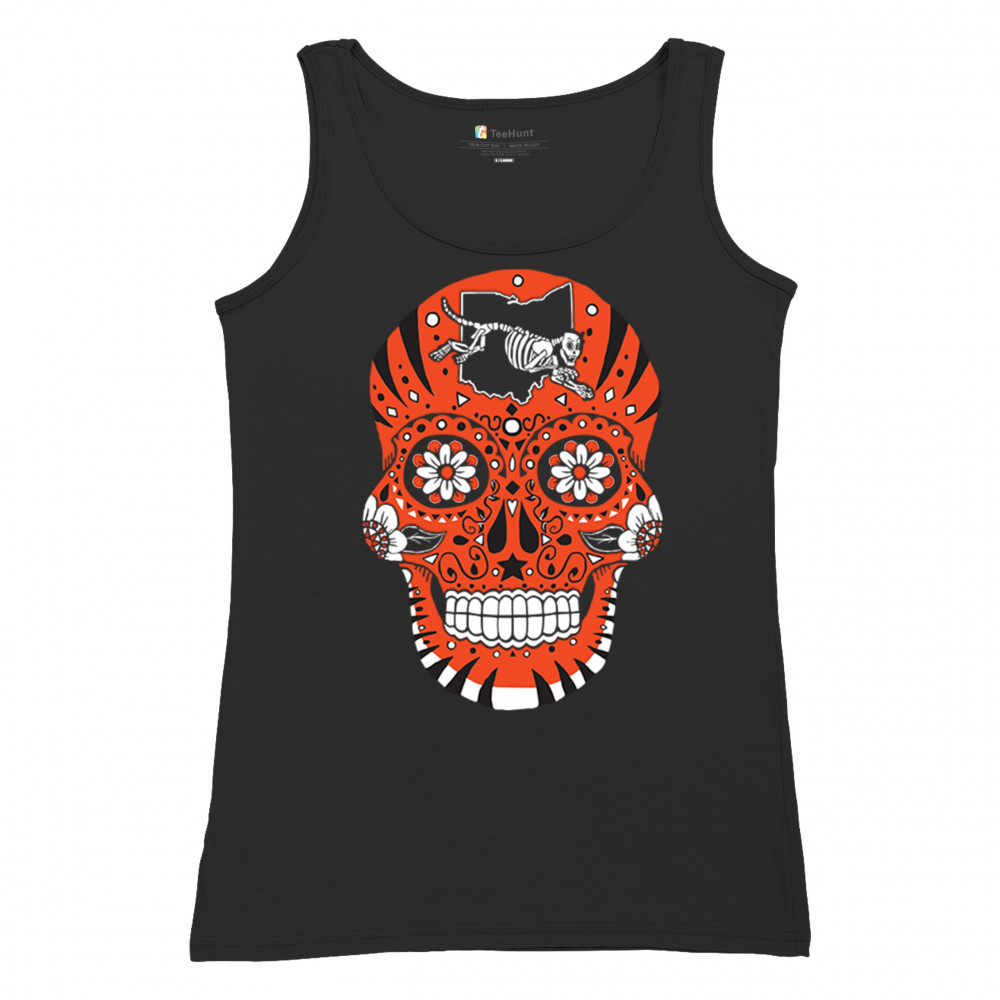 Cinci Sugar Skull with Queen City Paw, underdog grit, black & orange pride, Game Day energy, and playoff vibes.