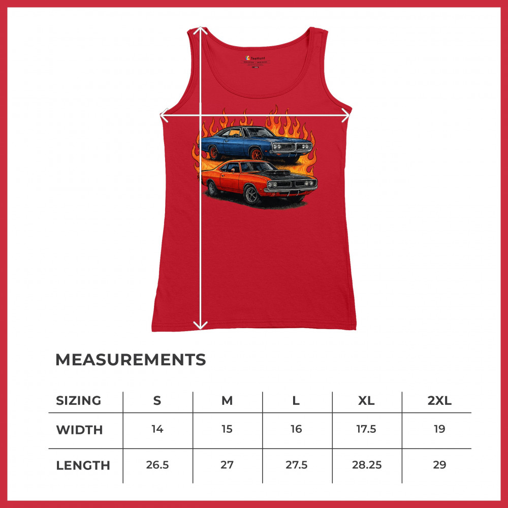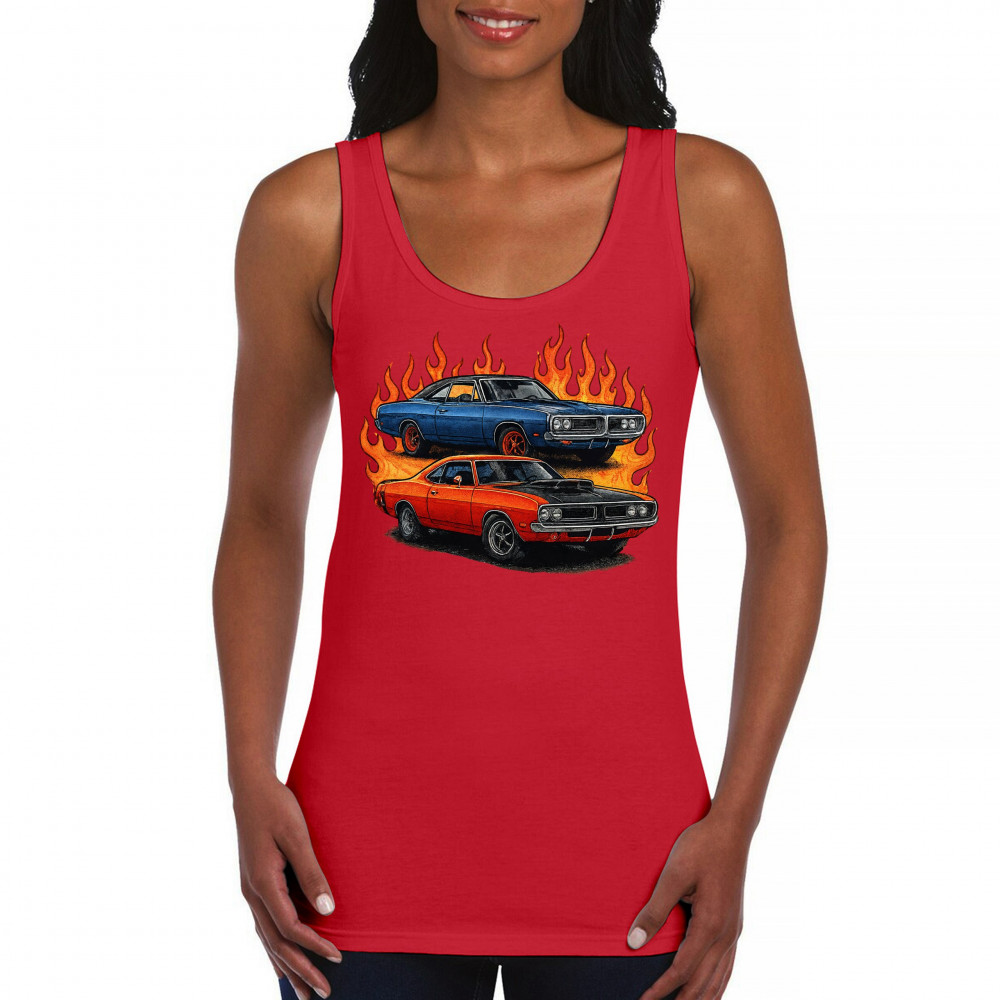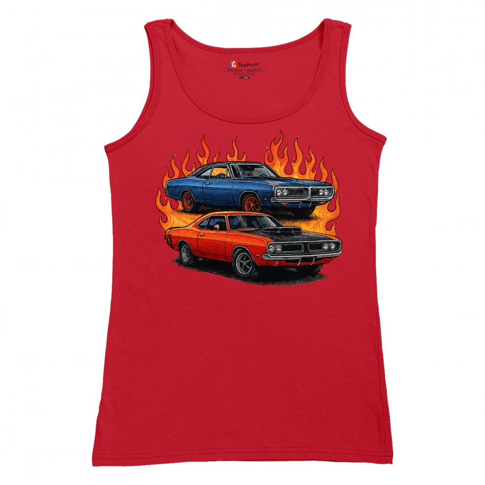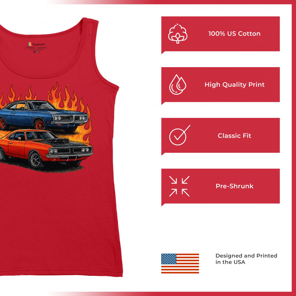 Bold flame design with classic muscle cars for gearheads and vintage horsepower lovers. Perfect for shows, cruise meets, and burnout nights.