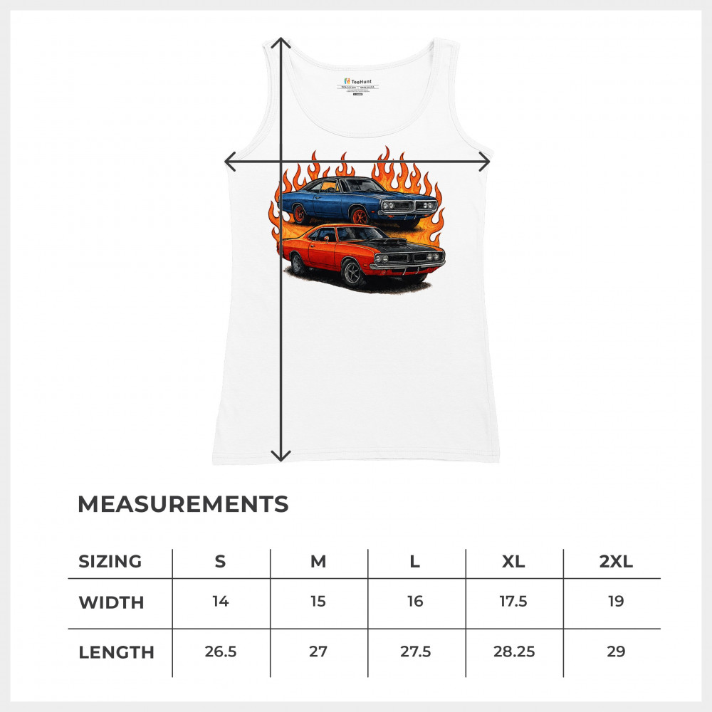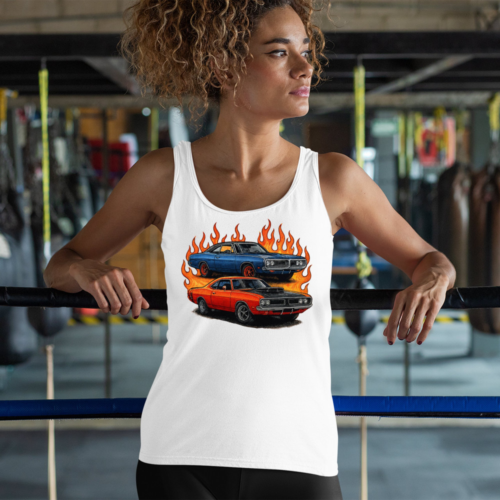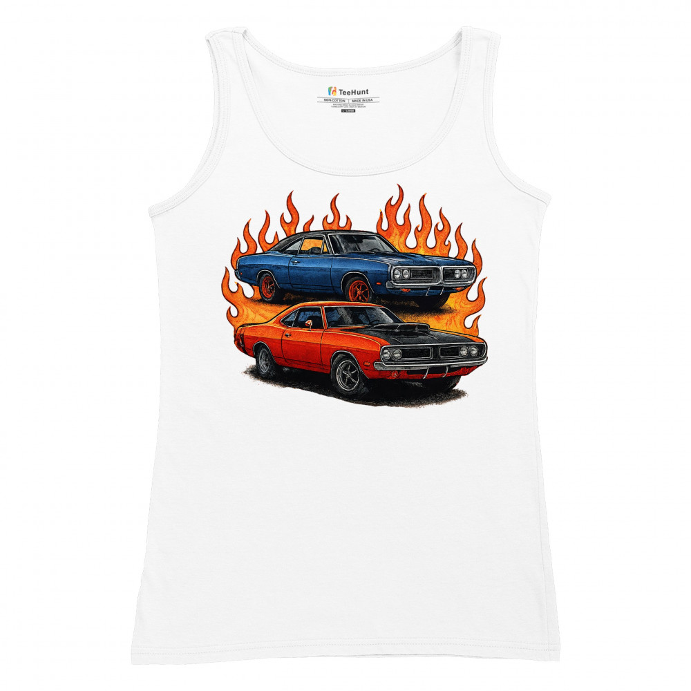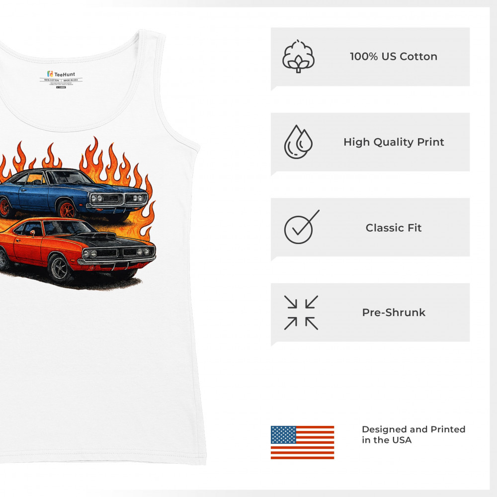 Bold flame design with classic muscle cars for gearheads and vintage horsepower lovers. Perfect for shows, cruise meets, and burnout nights.