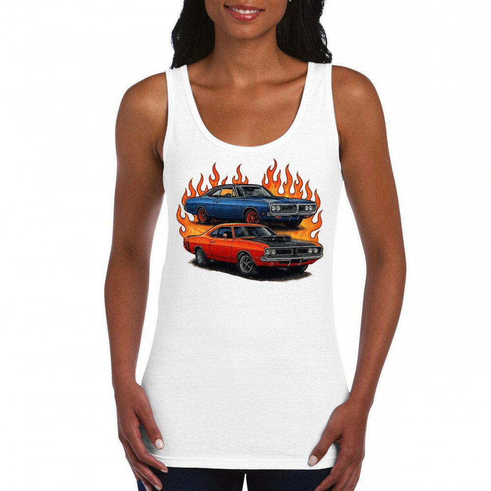 This flame-wrapped design showcases two classic muscle cars set ablaze with attitude, style, and vintage horsepower. Made for adrenaline seekers, rev heads, and car lovers who thrive on raw speed and retro fire. Whether at a burnout meet or a car show, this design lets your muscle car pride burn bright.