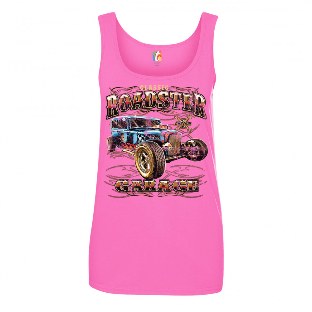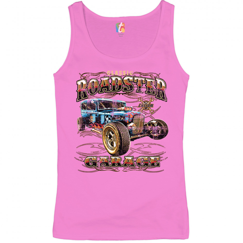 A print featuring a vintage-looking rat rod with flames and a skull with crossbones painted on it's side. "Classic Roadster" is written in the top and "Garage" in the bottom of the print. In the background there is a sign with crossed wrenches which says "custom". Great for Route 66 and hot rod fans.