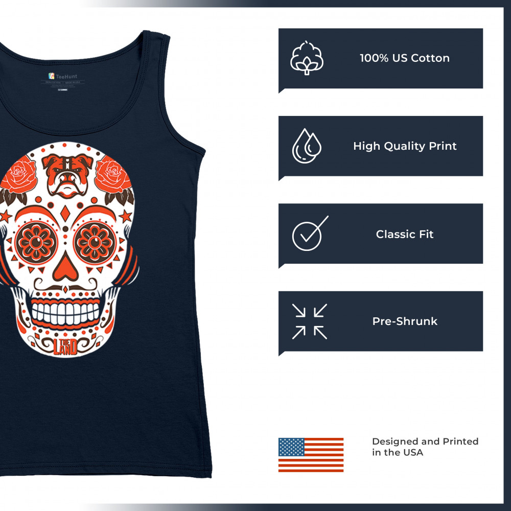 Cleveland Sugar Skull with Lake Erie pride, Rust Belt football grit, orange & brown tradition, playoff vibes, and Game Day passion.