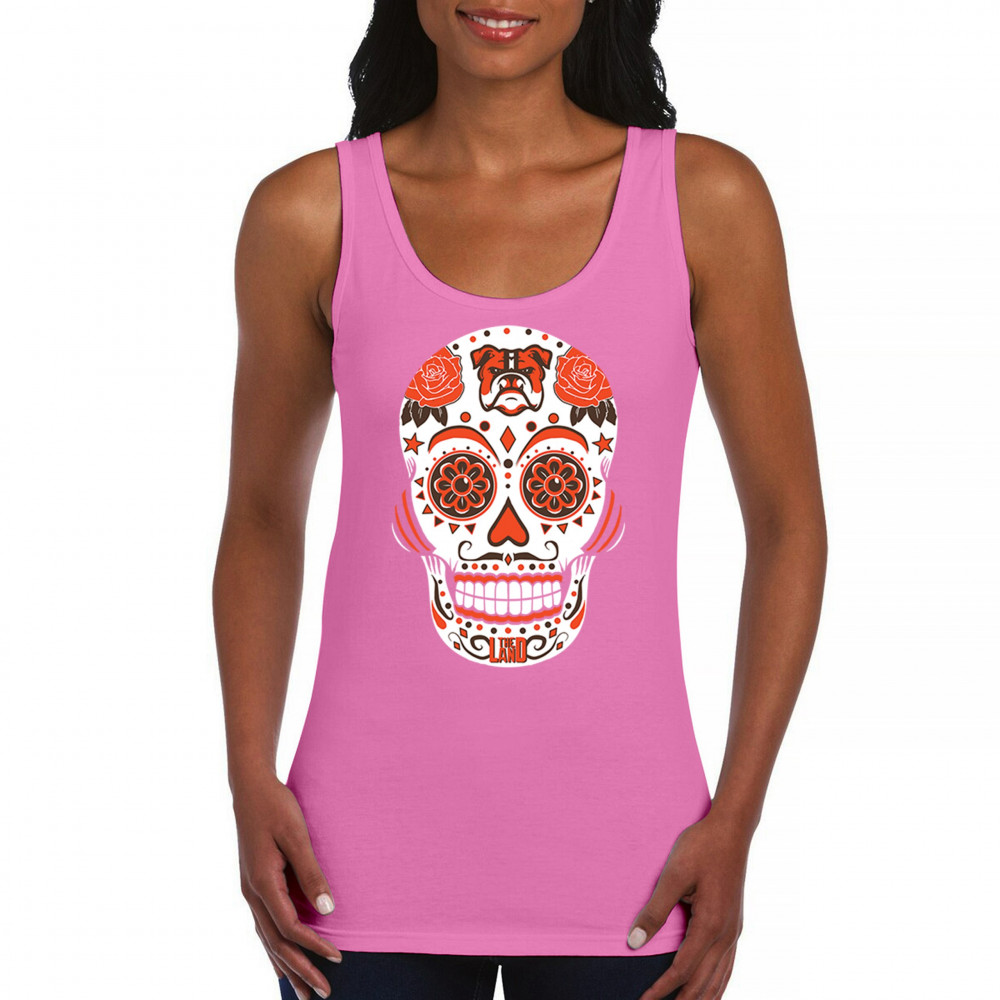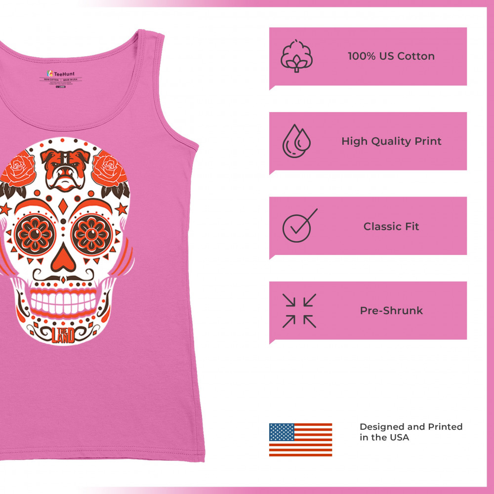 Cleveland Sugar Skull with Lake Erie pride, Rust Belt football grit, orange & brown tradition, playoff vibes, and Game Day passion.