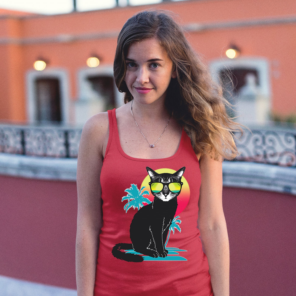 COOL SUMMER CAT women's tank top neon kitty on a beach animal lovers red