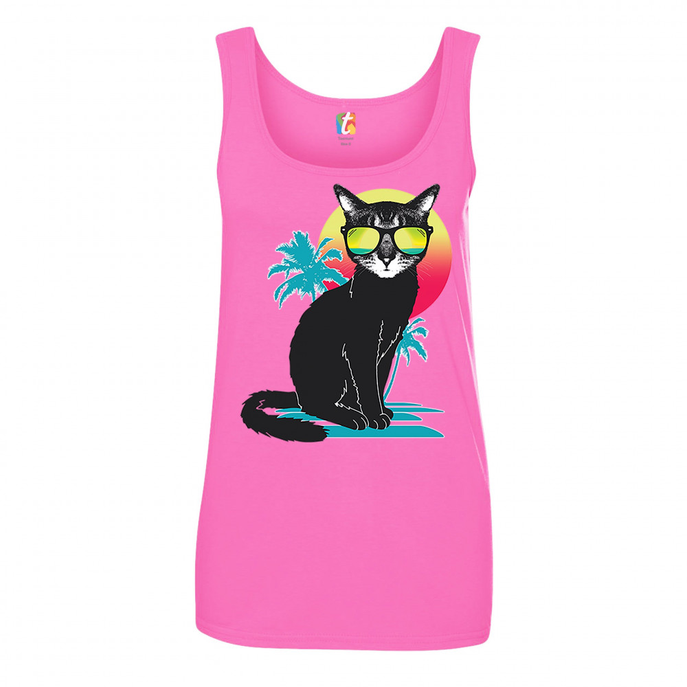 COOL SUMMER CAT women's tank top neon kitty on a beach animal lovers pink