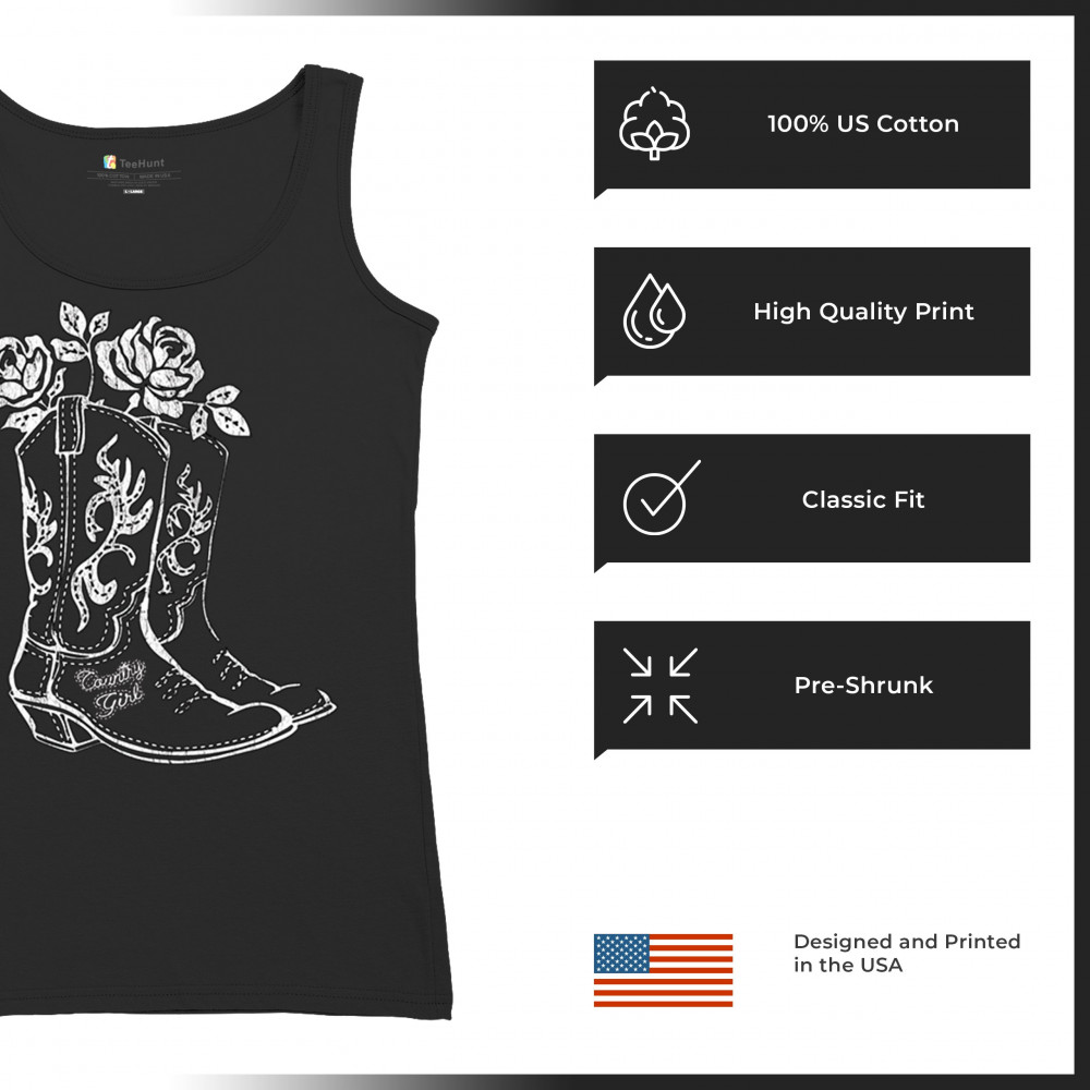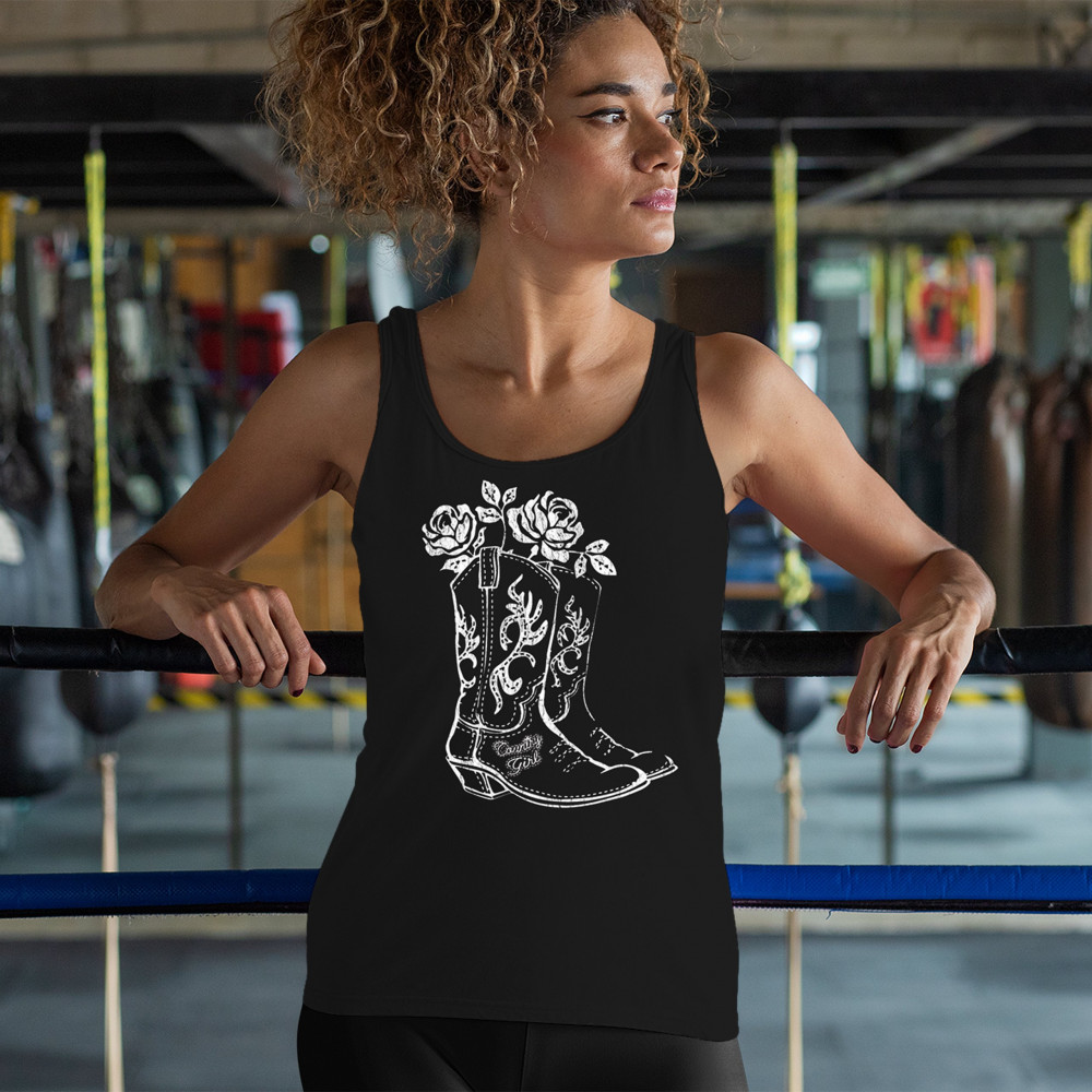Rustic country girl design with boots and roses. Vintage western art perfect for cowgirls, rodeos, fairs, and outdoor country events.