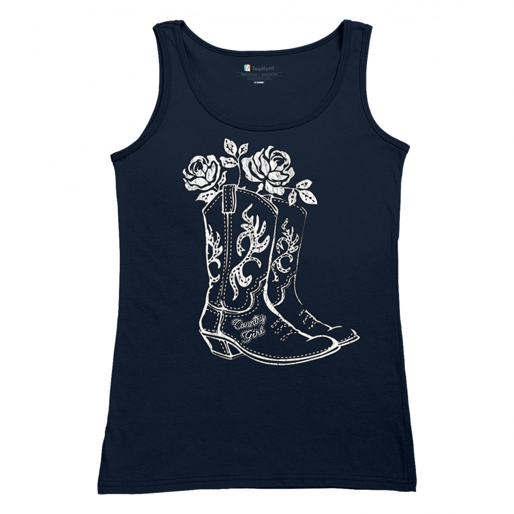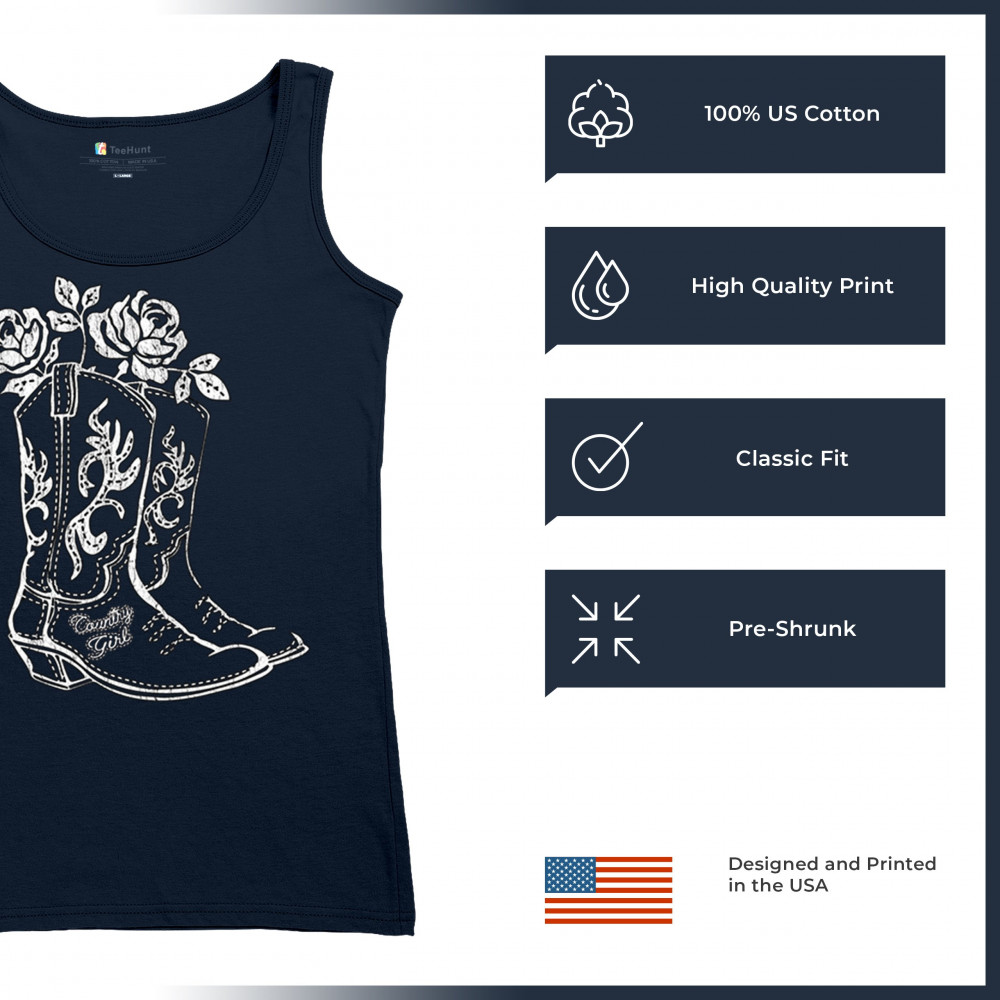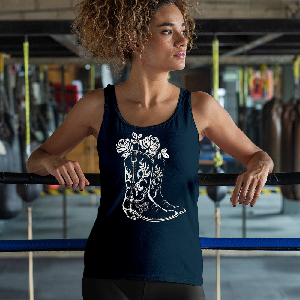 Rustic country girl design with boots and roses. Vintage western art perfect for cowgirls, rodeos, fairs, and outdoor country events.