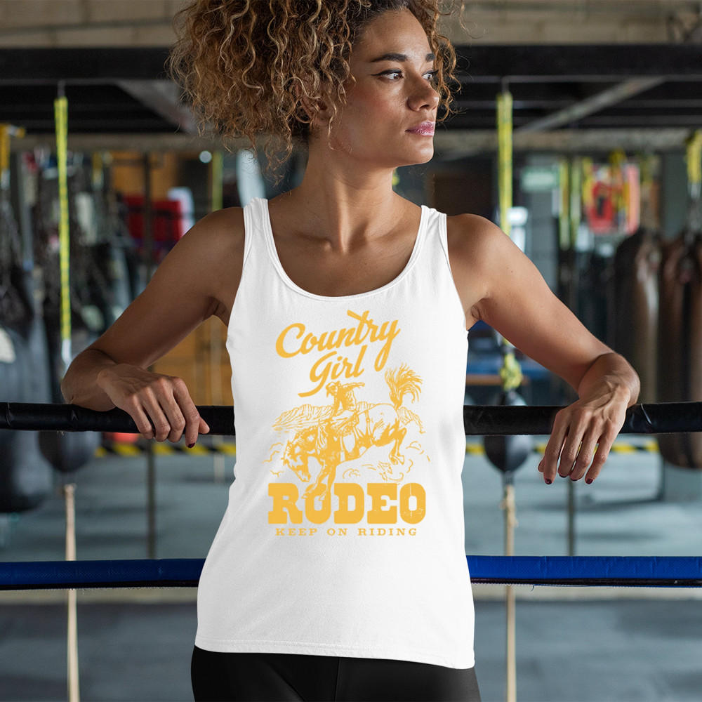 Celebrate cowgirl spirit with this bold design featuring a fearless rider holding strong in classic rodeo fashion. Built for western women who embrace rural life, horse riding, and country toughness. Whether it's for fairs, rodeos, or music nights, this design rides with you.