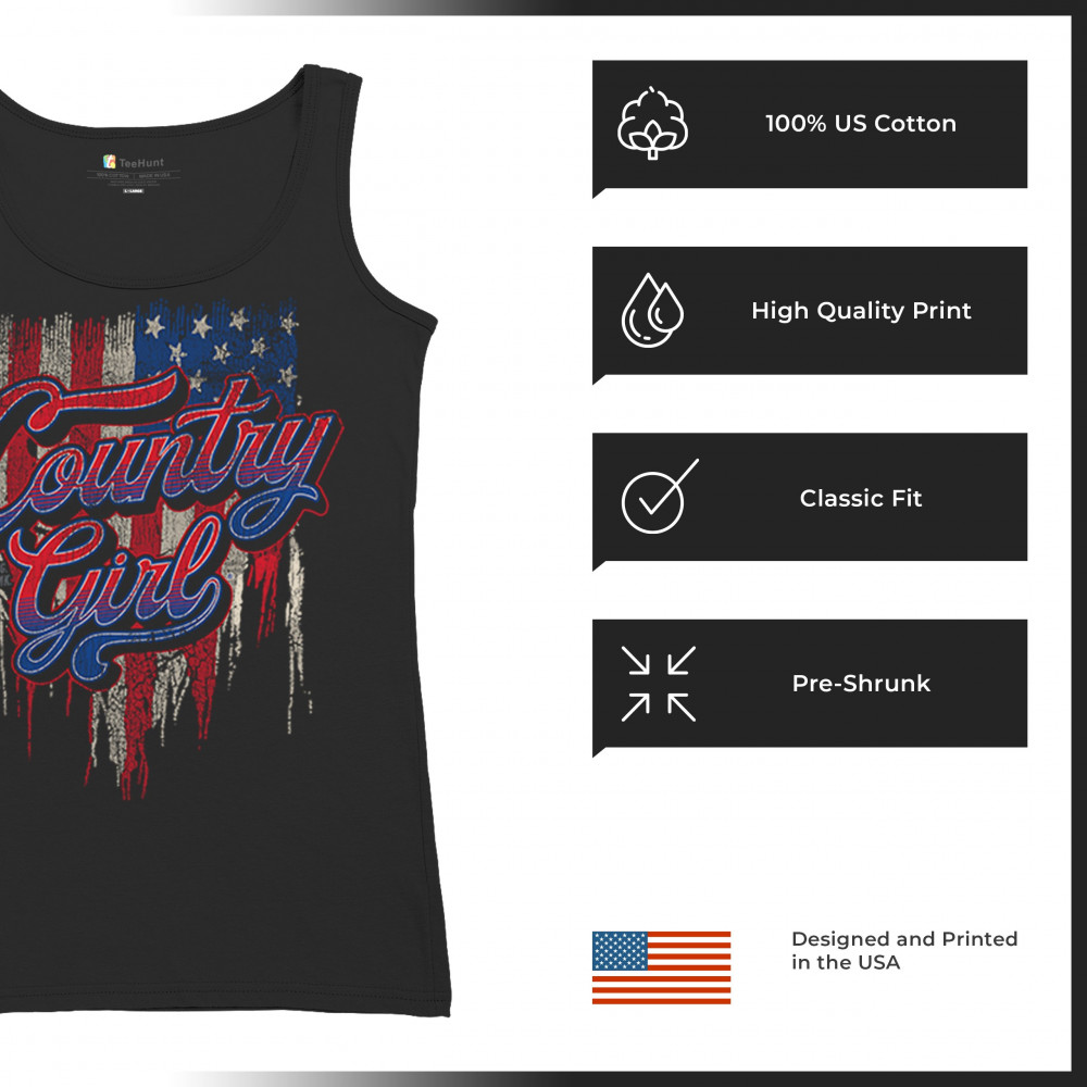 Patriotic country girl design with flag backdrop and bold script—perfect for rodeos, BBQs, ranch life, or 4th of July pride.