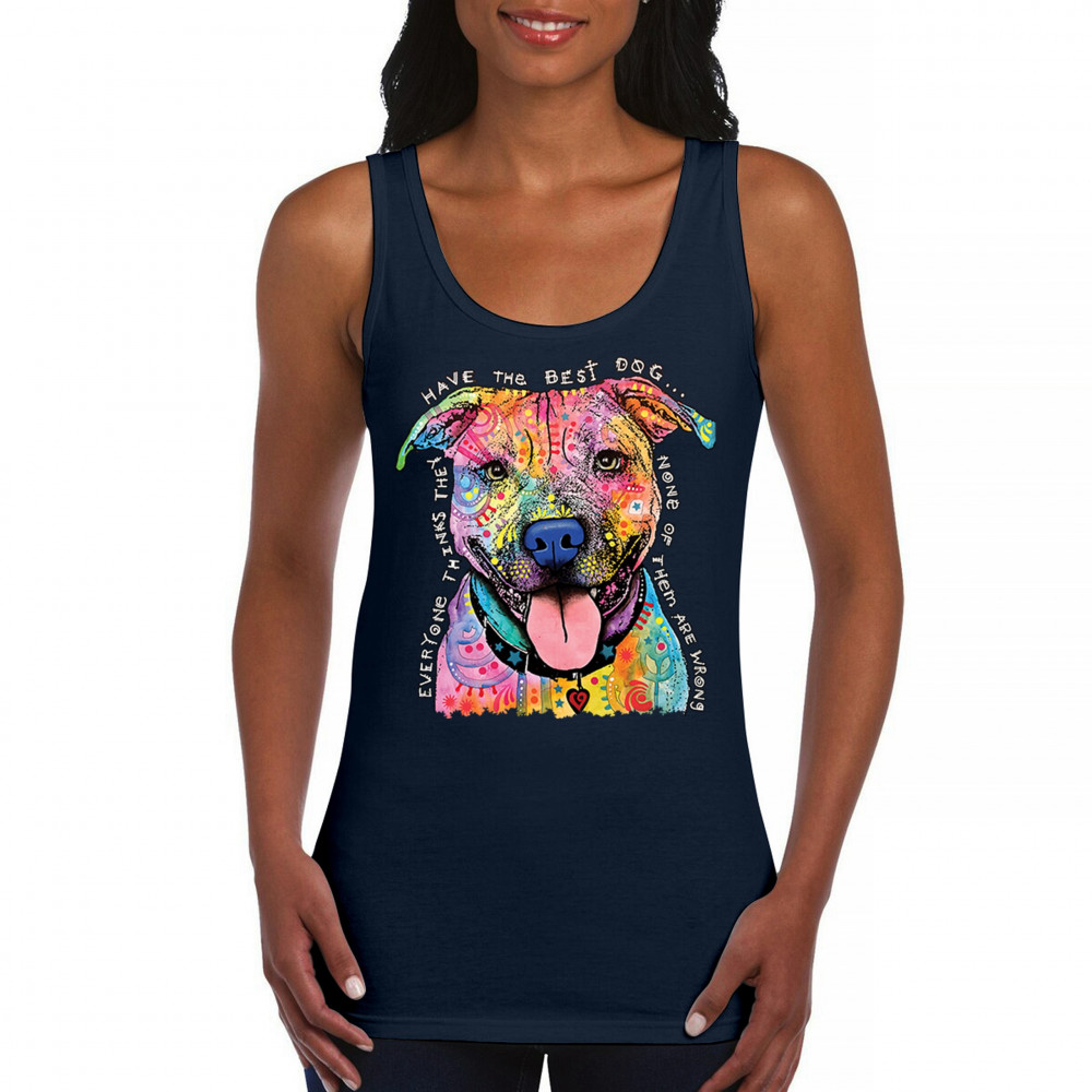 DEAN RUSSO COLORFUL PIT BULL women's tank top everyone has best dogs navy blue