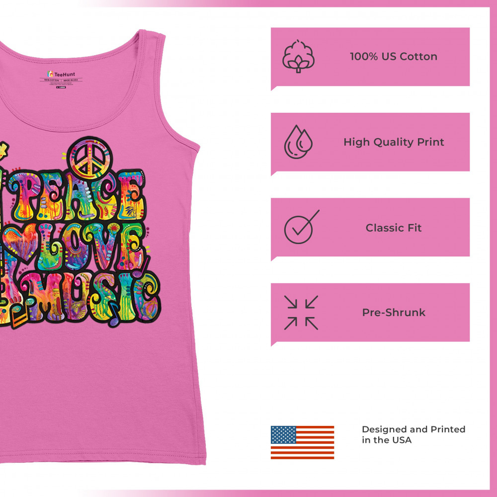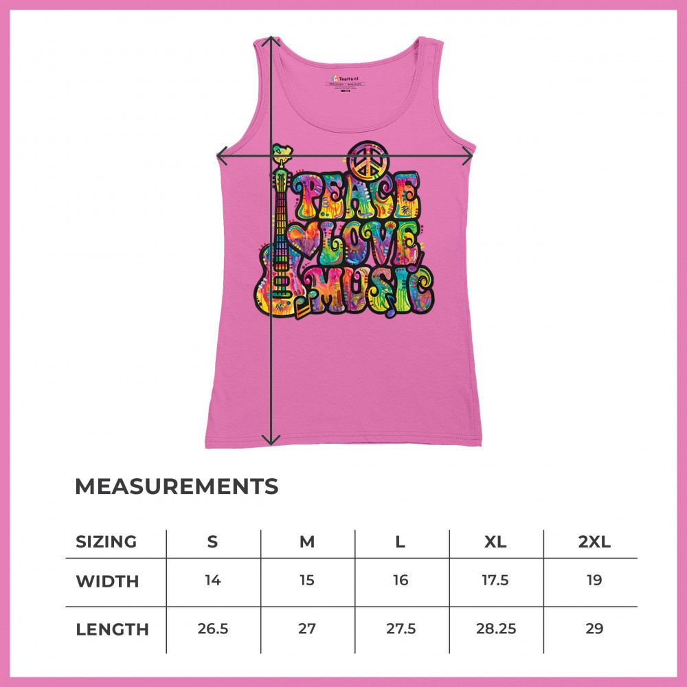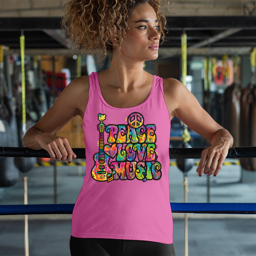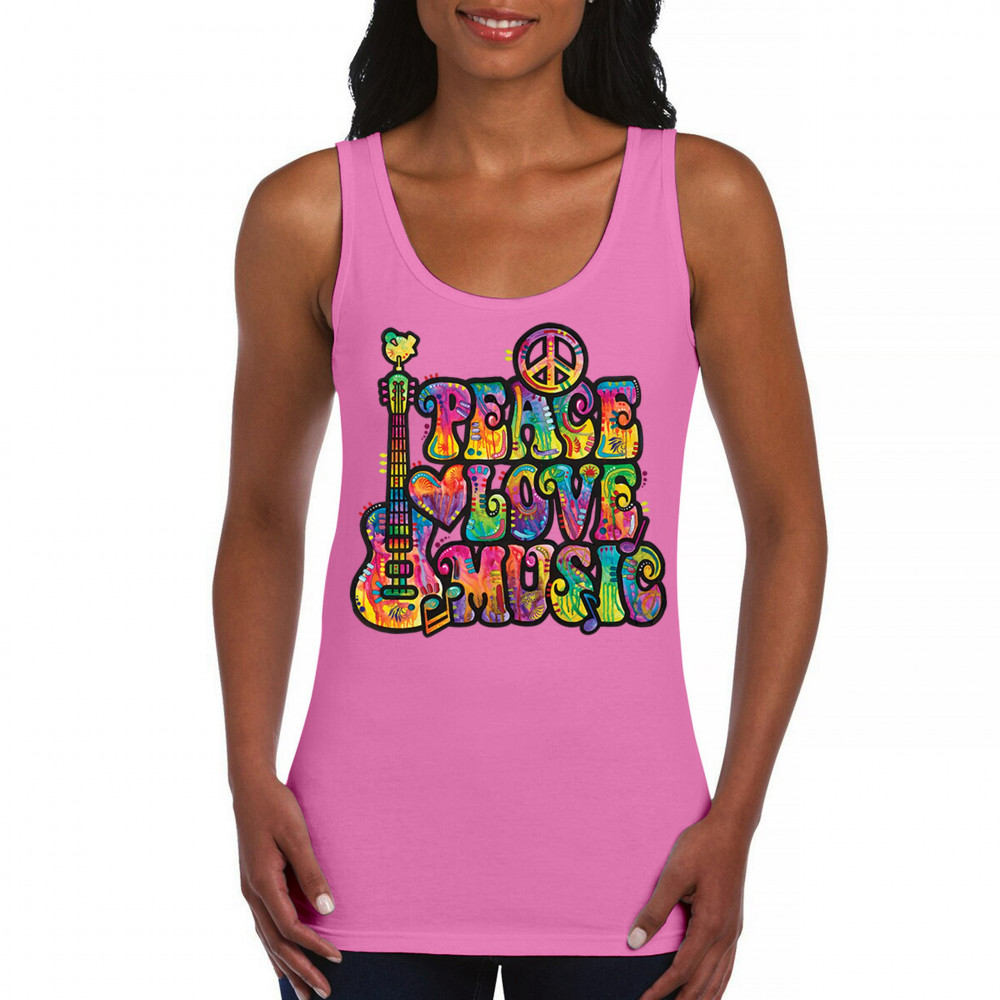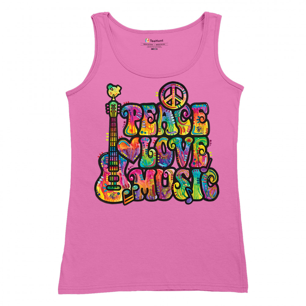 DEAN RUSSO PEACE LOVE MUSIC women's tank top guitar happy good vibe pink