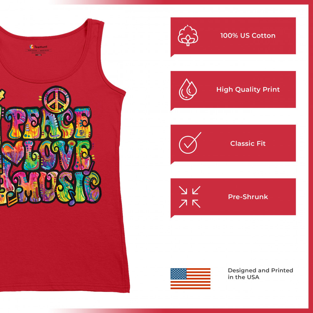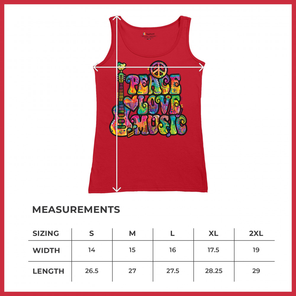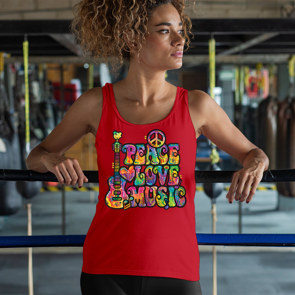 DEAN RUSSO PEACE LOVE MUSIC women's tank top guitar happy good vibe red