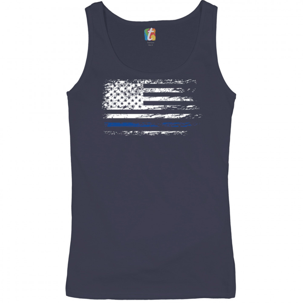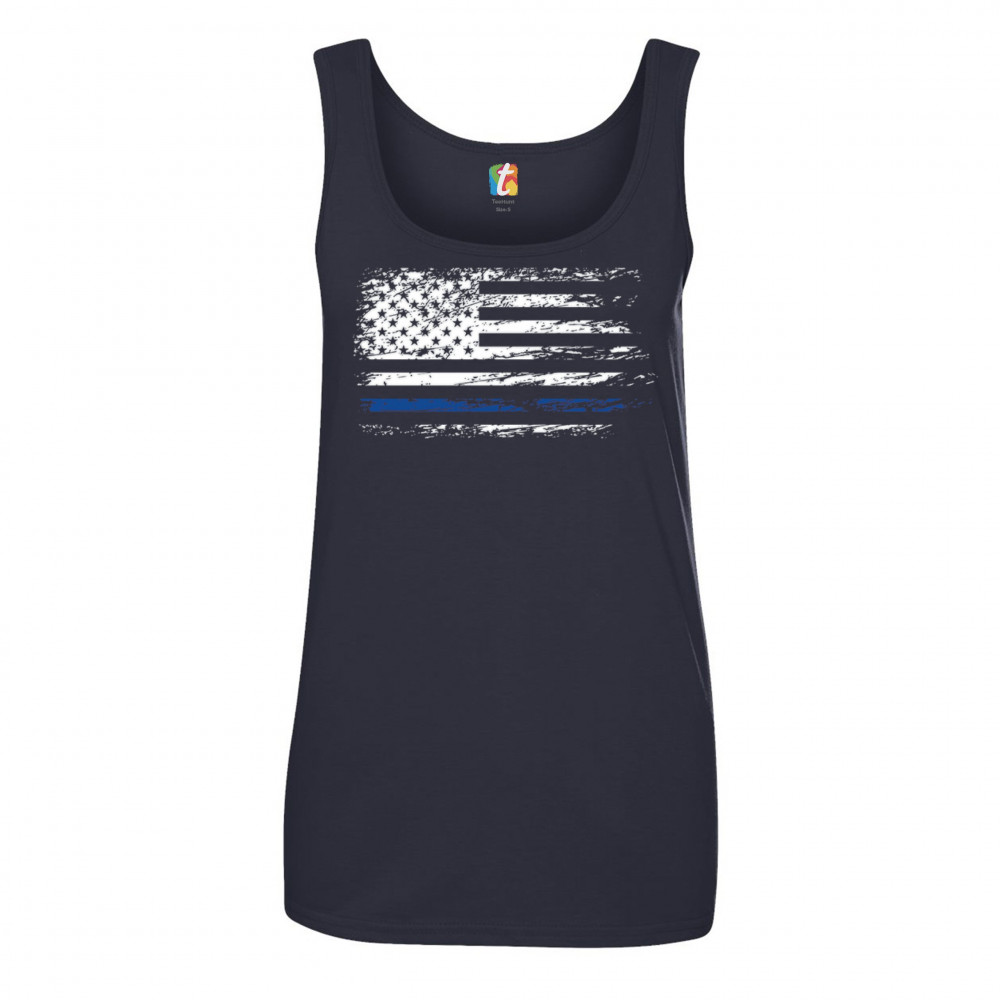 DISTRESSED THIN BLUE LINE AMERICAN FLAG women's tank top patriotic police navy blue