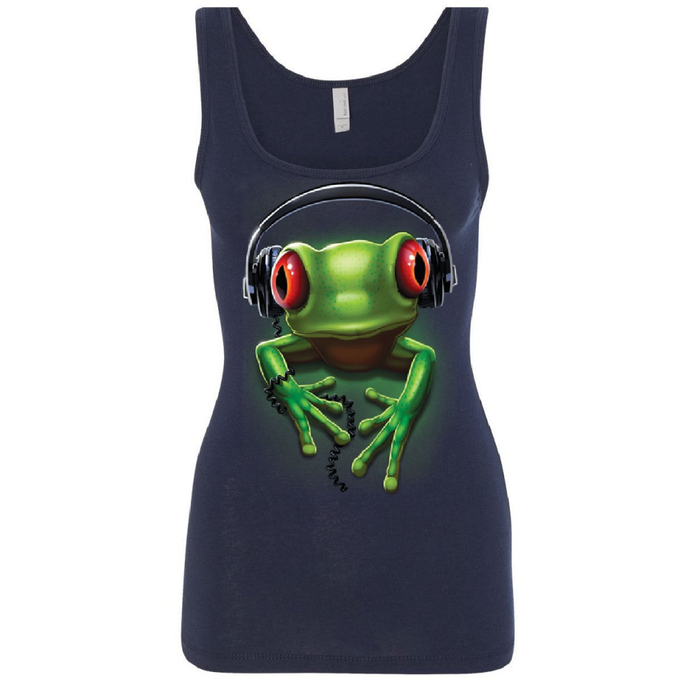 DJ FROG WITH HEADPHONES women's tank top cute animal music wildlife rock top navy blue