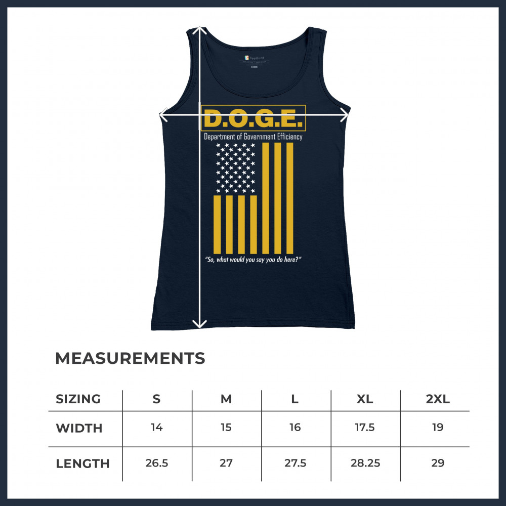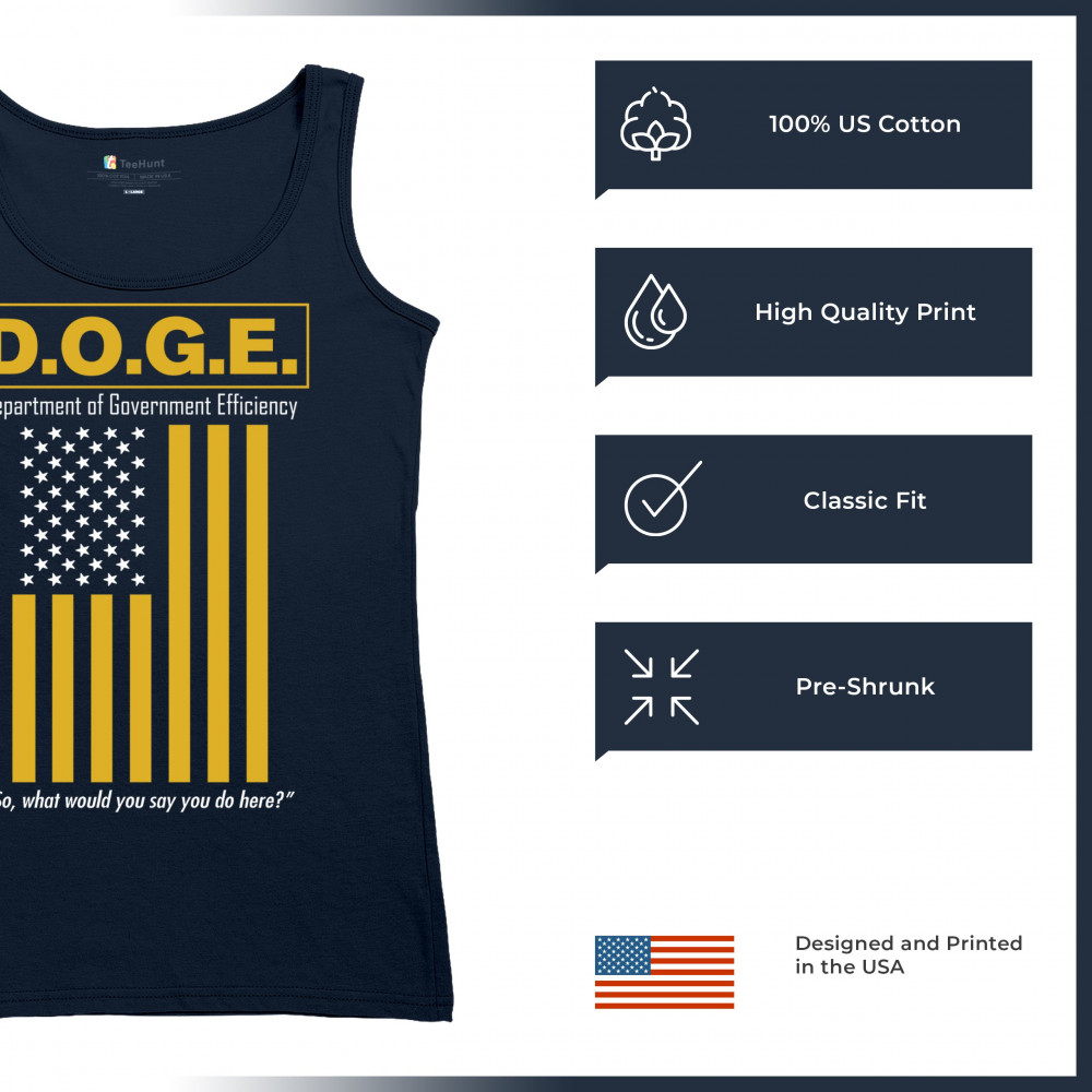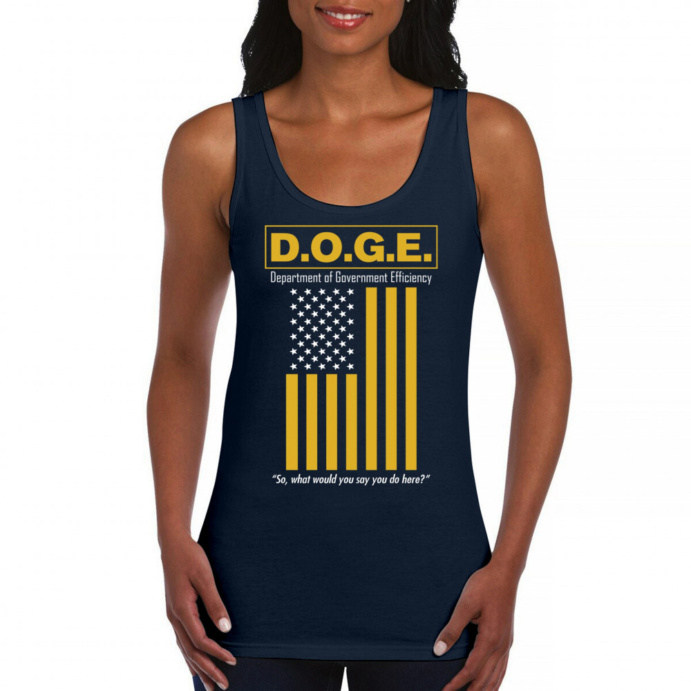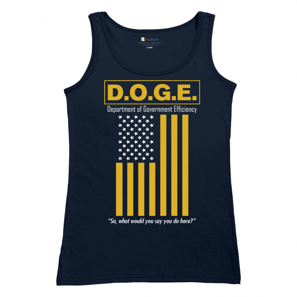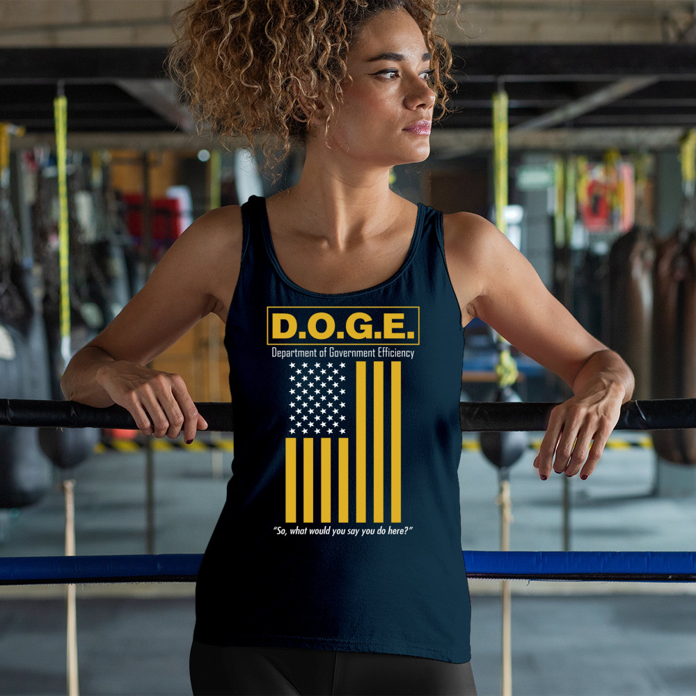 The D.O.G.E. Department of Government Efficiency design features bold yellow lettering and a sarcastic punchline aimed at bloated systems. Clean typography paired with a reimagined American flag gives this political parody retro appeal. Ideal for libertarians, patriots, or anyone fed up with inefficiency and red tape.