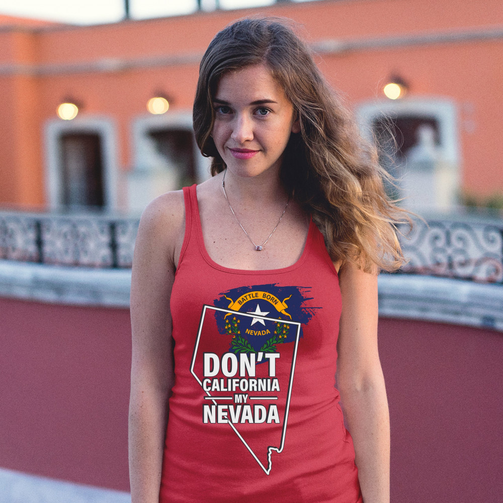 A political print featuring a silhouette of the state of Nevada and it's flag on the inside. The print says: "Don't California my Nevada". A great choice for anyone who is concerned for a huge number of Californians moving to their beloved state.