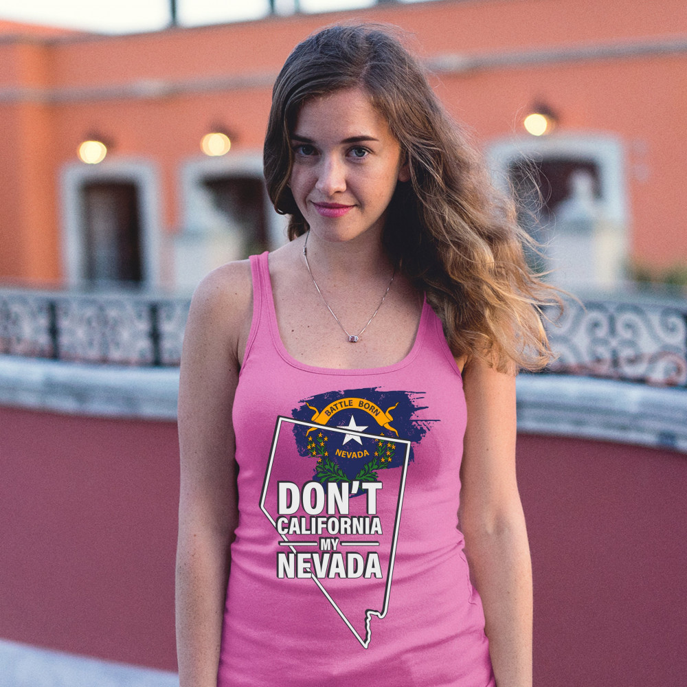 A political print featuring a silhouette of the state of Nevada and it's flag on the inside. The print says: "Don't California my Nevada". A great choice for anyone who is concerned for a huge number of Californians moving to their beloved state.