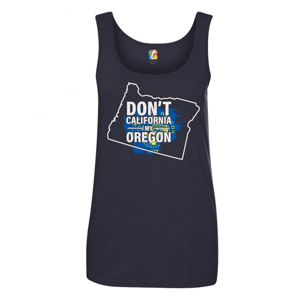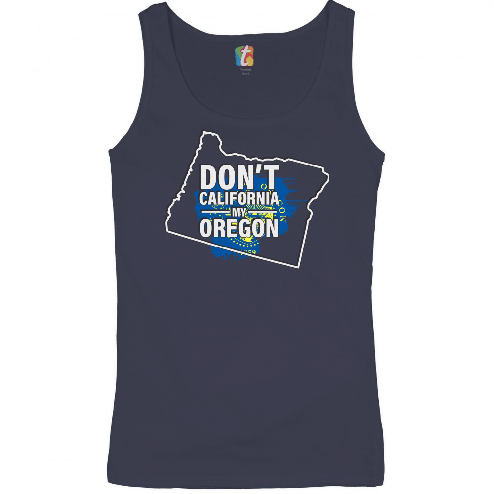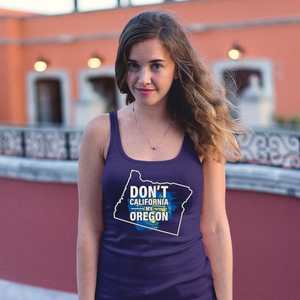 A political print featuring a silhouette of the state of Oregon and the Seal of the State of Oregon inside of it. The print says: "Don't California my Oregon". A great choice for anyone who is concerned for a huge number of Californians moving to their be