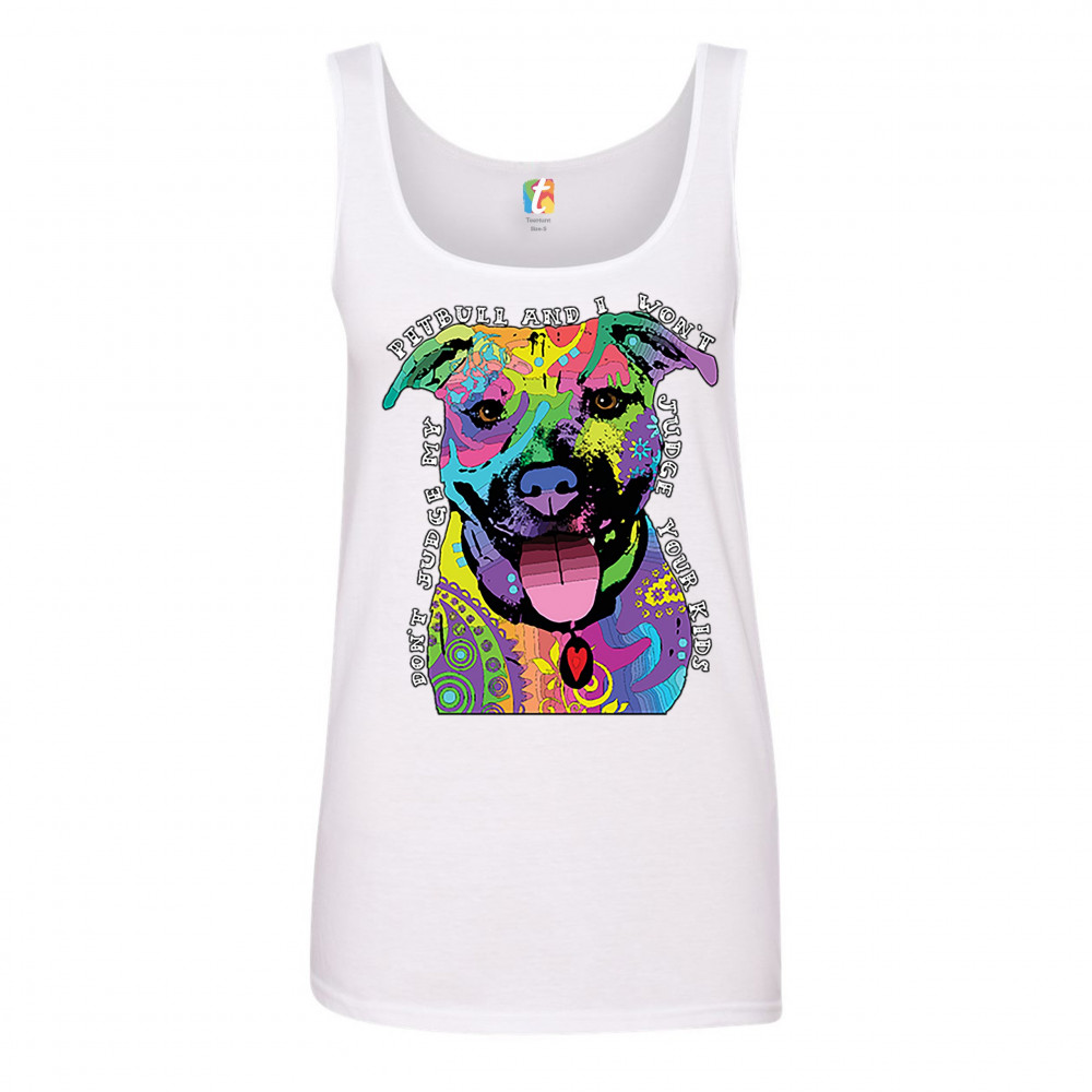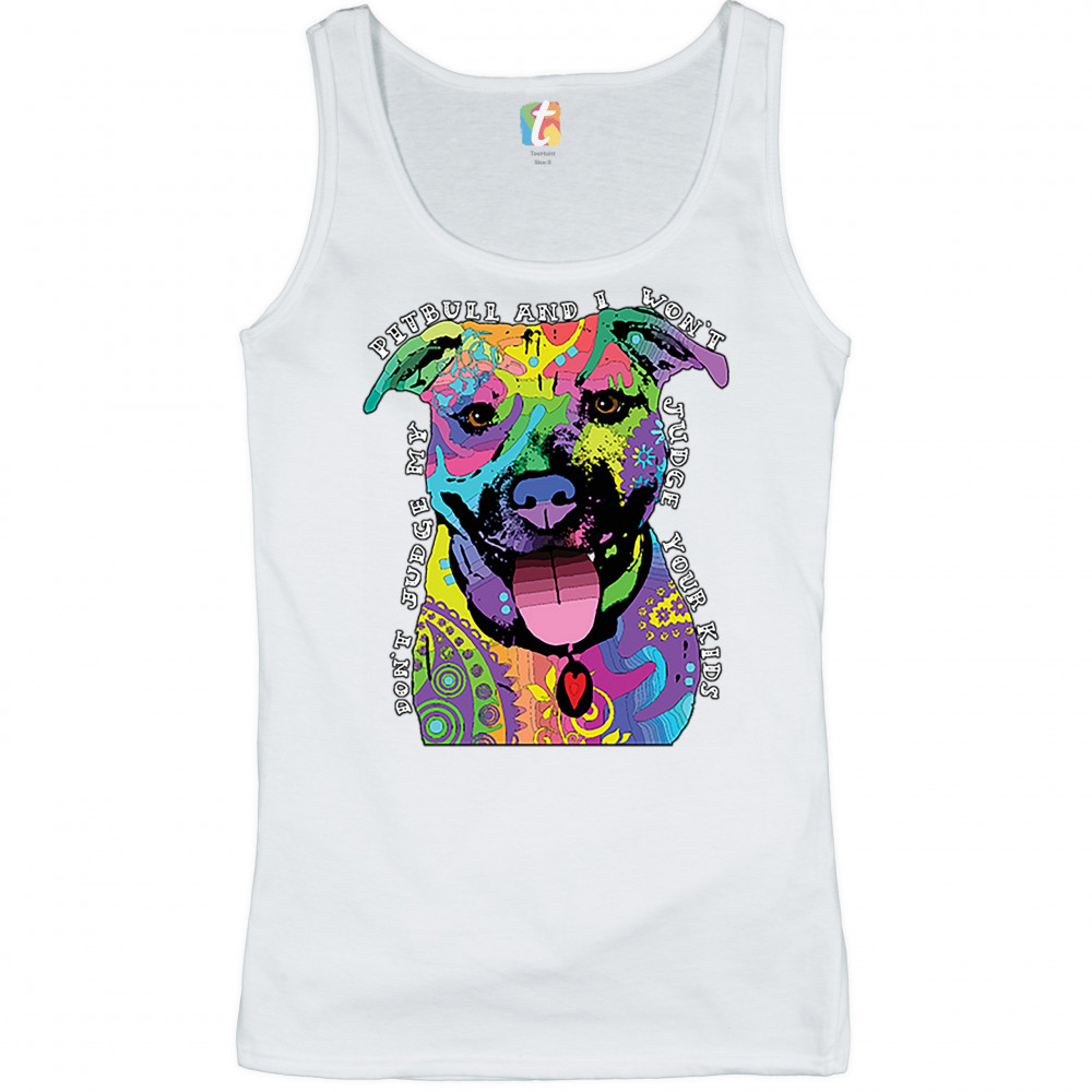 DON'T JUDGE MY PIT BULL women's tank top funny andy maxx dog lover pet owner white