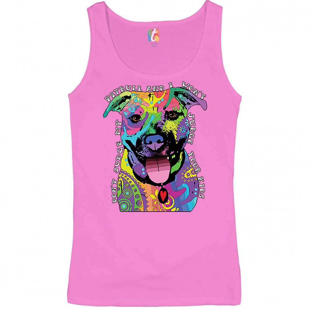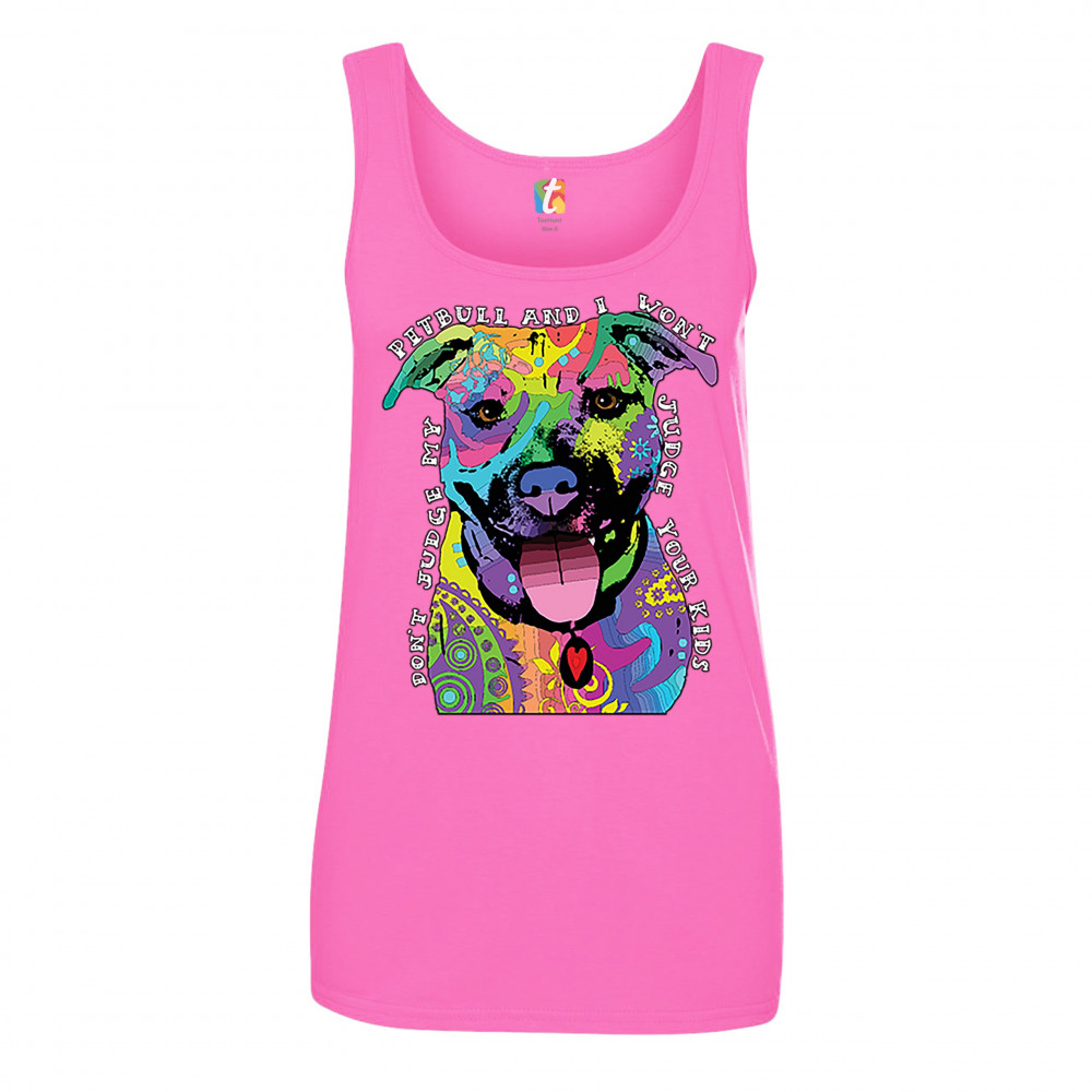 DON'T JUDGE MY PIT BULL women's tank top funny andy maxx dog lover pet owner pink