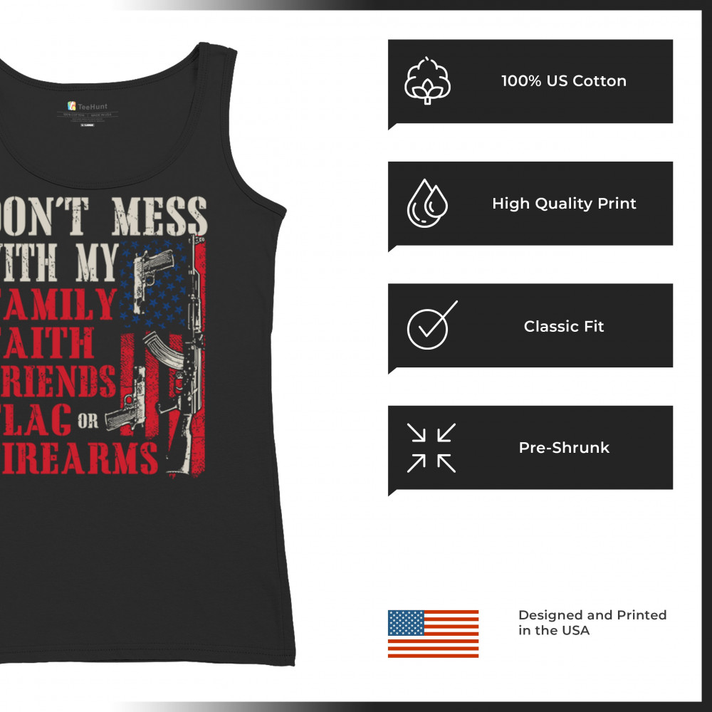Patriotic design for gun owners and liberty-lovers. Bold message defends family, flag, and firearms with unapologetic American pride.