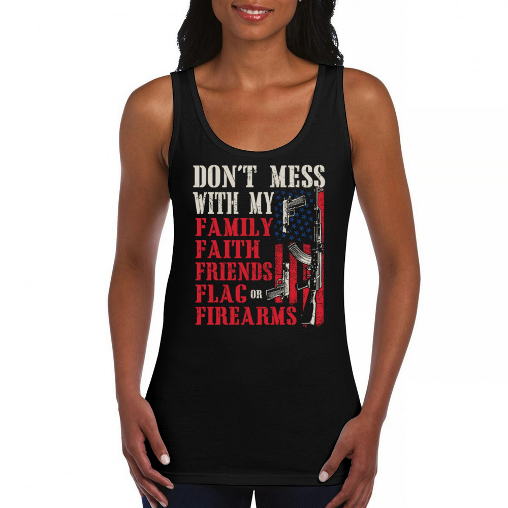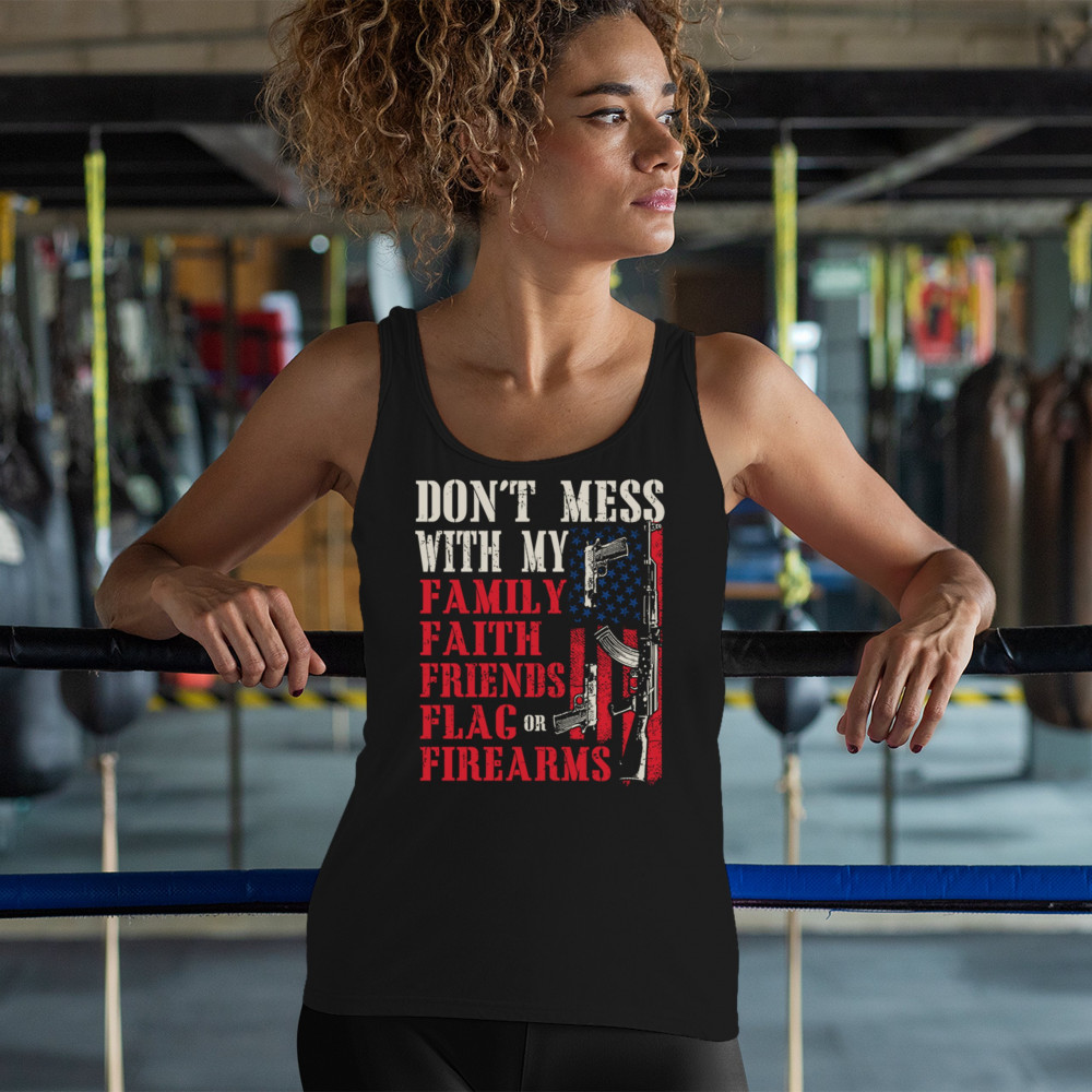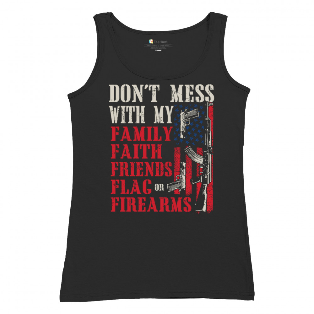 Don’t mess with a patriot’s core. This powerful design shouts loyalty to family, faith, friends, flag, and firearms. Featuring bold lettering on an American flag backdrop, it’s made for defenders of freedom, gun rights, and American values. Ideal for veterans, 2A supporters, and anyone who won’t back down from defending what they love.
