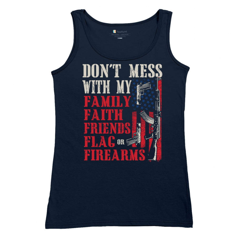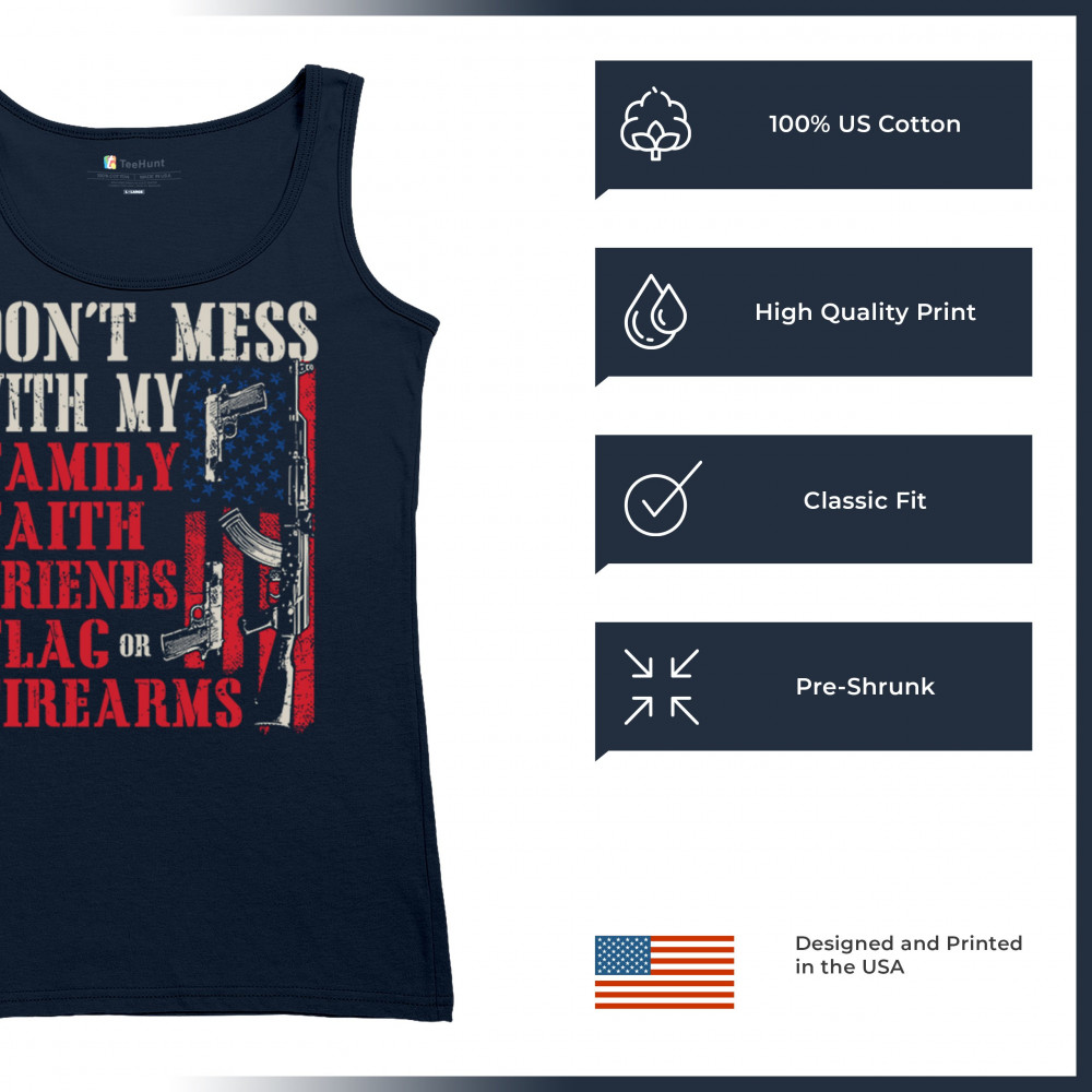 Patriotic design for gun owners and liberty-lovers. Bold message defends family, flag, and firearms with unapologetic American pride.