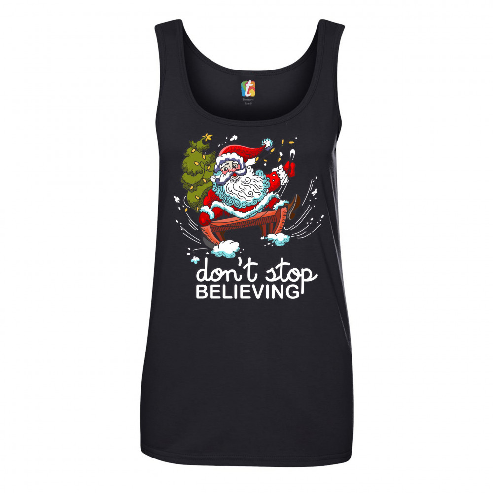 DON'T STOP BELIEVING women's tank top christmas holiday spirit santa claus black