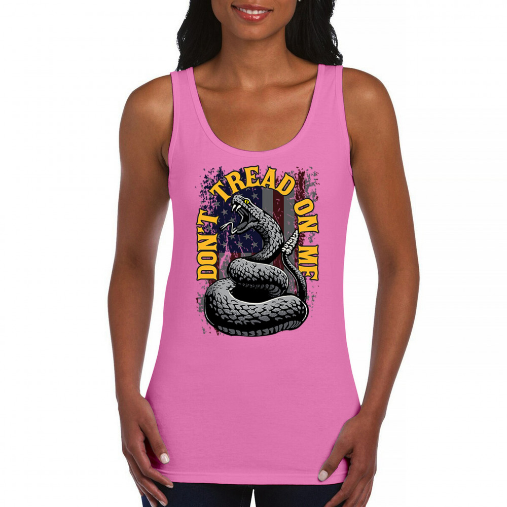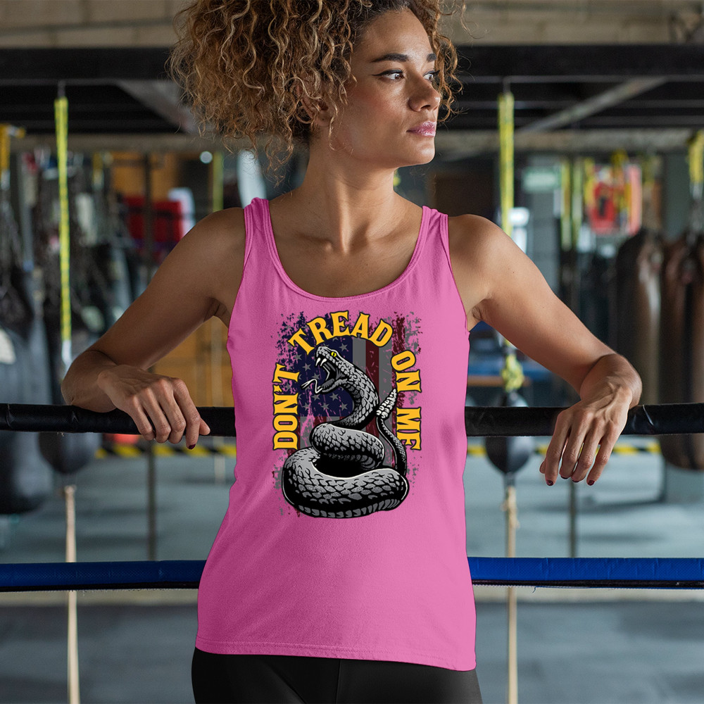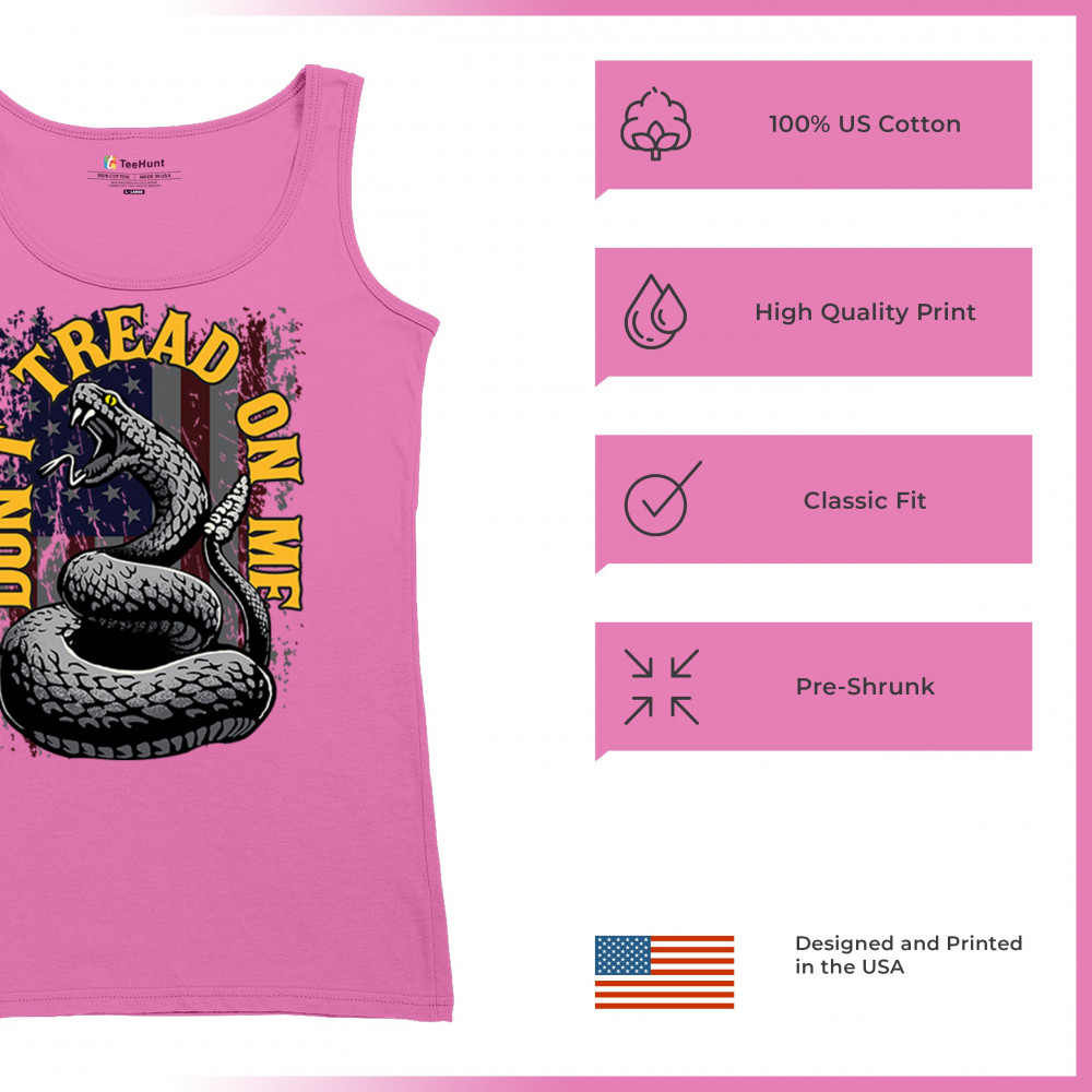 Bold "Don't Tread on Me" design with snake and American flag. Ideal for patriots. Show your love for freedom and independence.