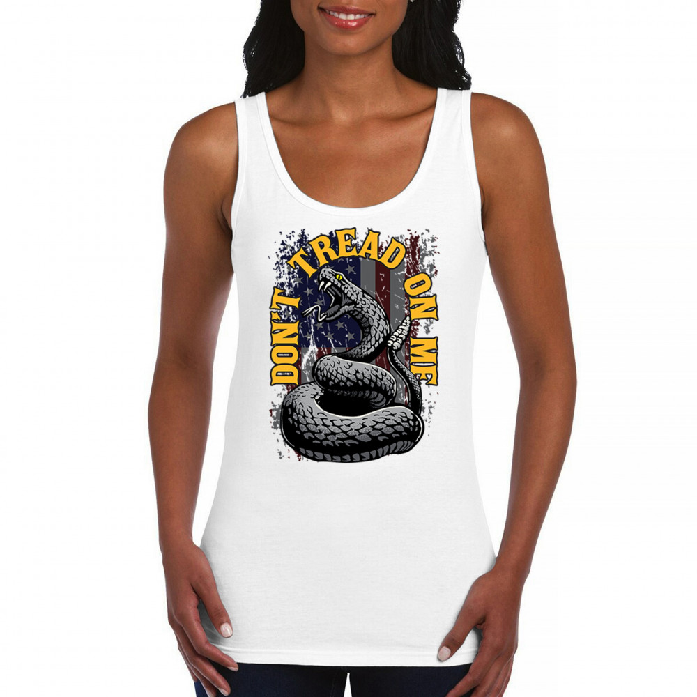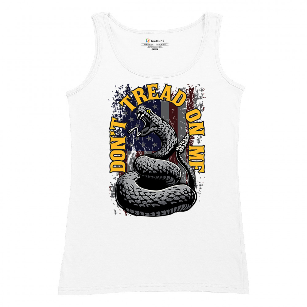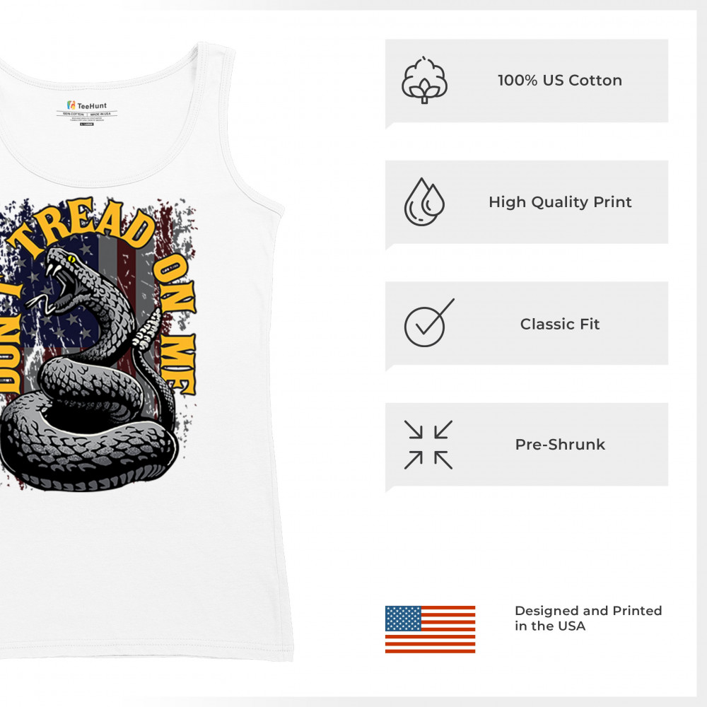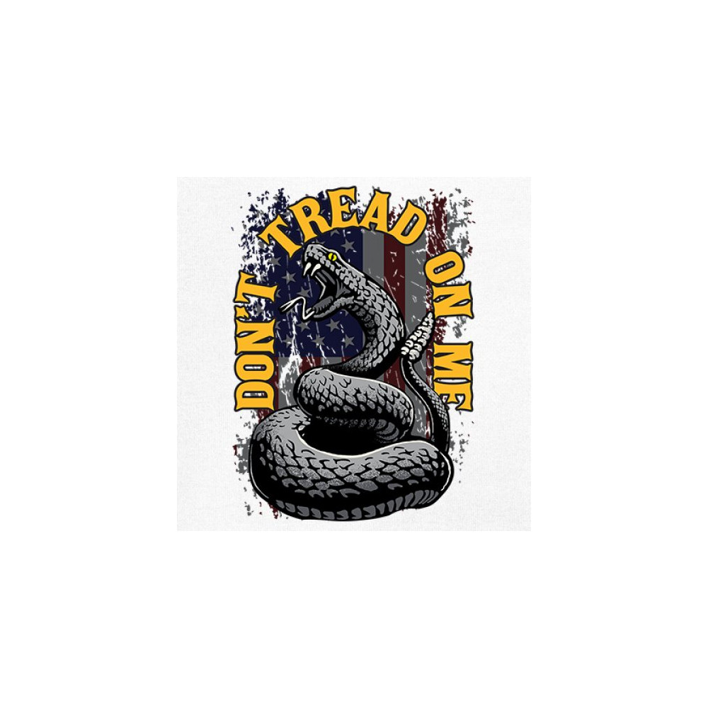 Bold "Don't Tread on Me" design with snake and American flag. Ideal for patriots. Show your love for freedom and independence.
