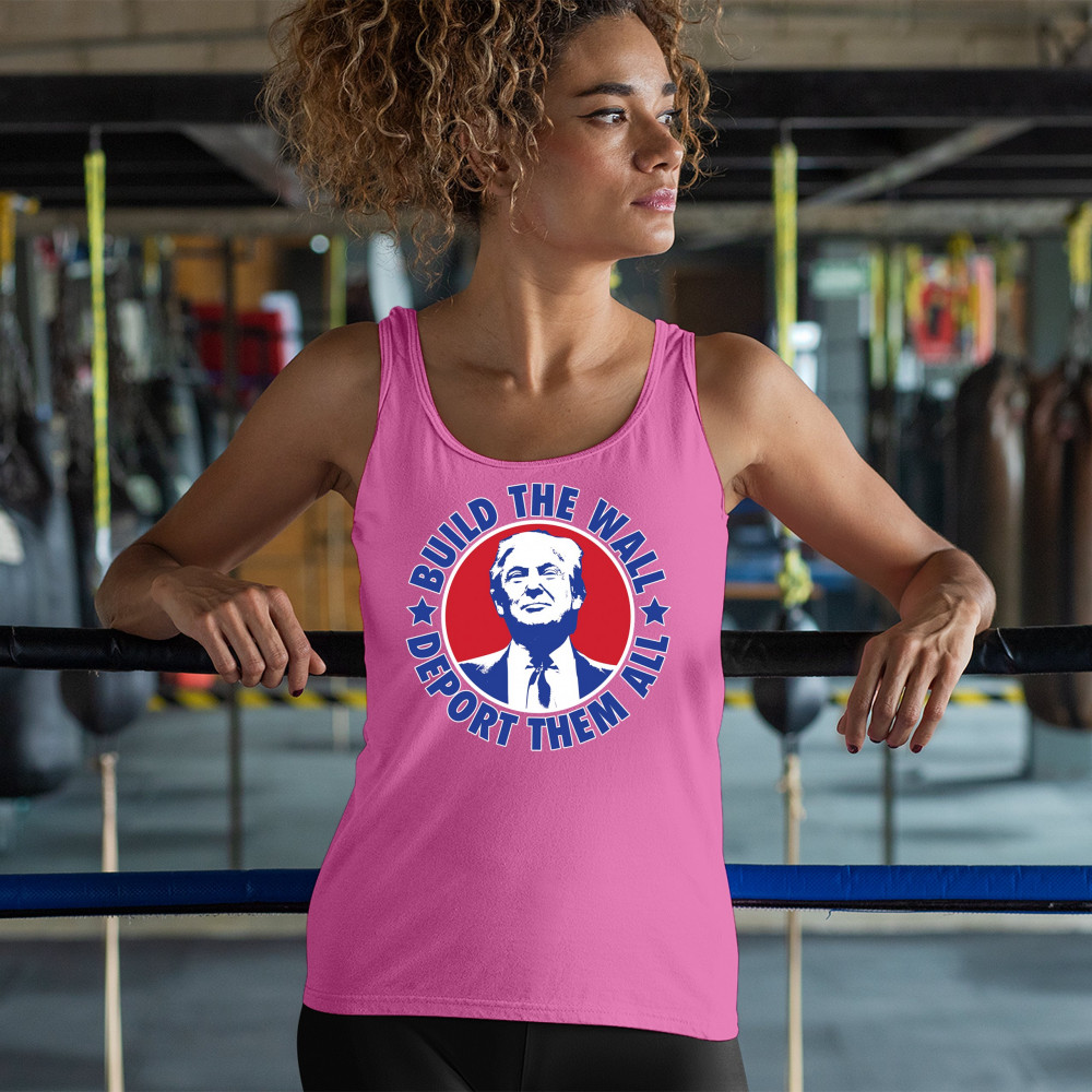 Showcase your unwavering support with a bold design that champions America first. Featuring the "Build the Wall Deport Them All Trump 2024" message, this piece is a must-have for conservatives, symbolizing trust in God over government, and a commitment to never surrender. Adorned with the American flag and a call to rebelution, it's perfect for any Trump supporter ready to stand against the tide.