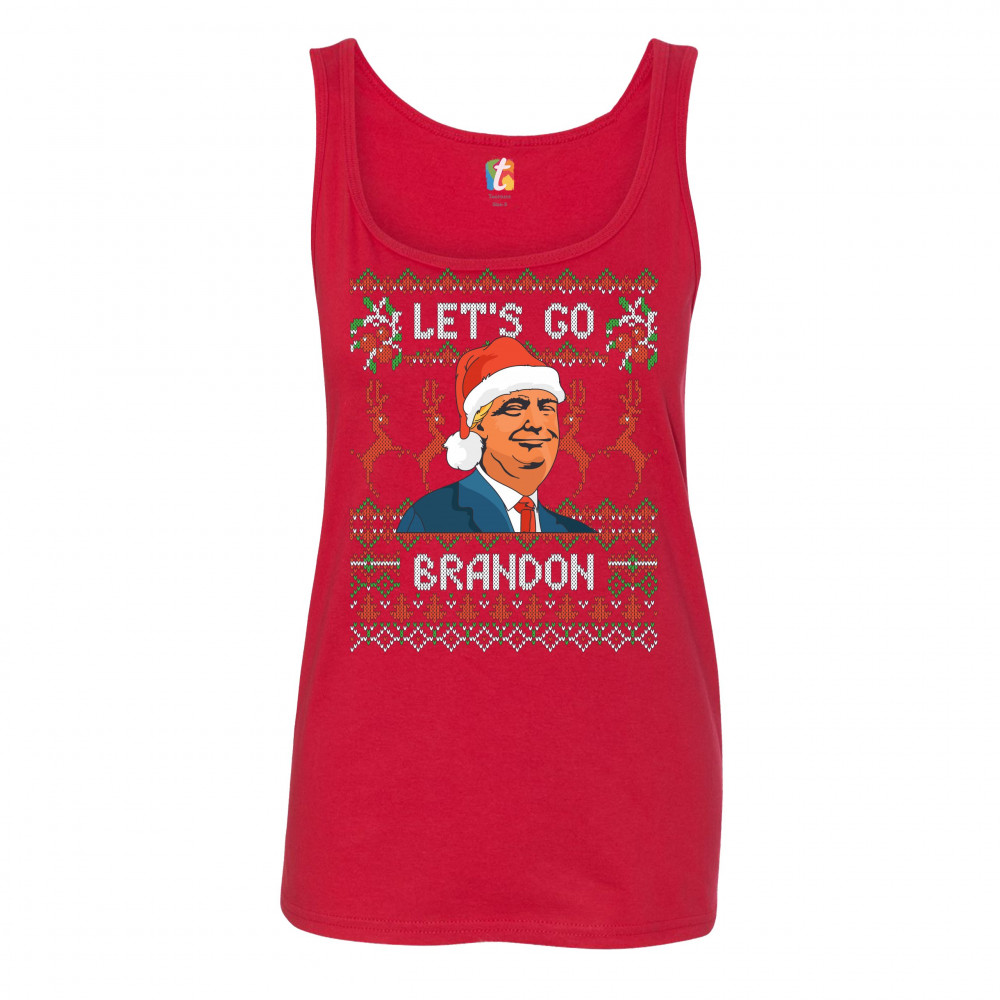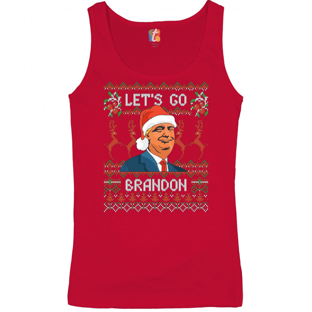 A funny print saying: "Let's Go Brandon" and featuring smiling Donald Trump wearing a Christmas Hat. The print is decorated as a Christmas ugly Sweater. A great choice to wear for a Christmas or New Year's Eve party and entertain your friends!